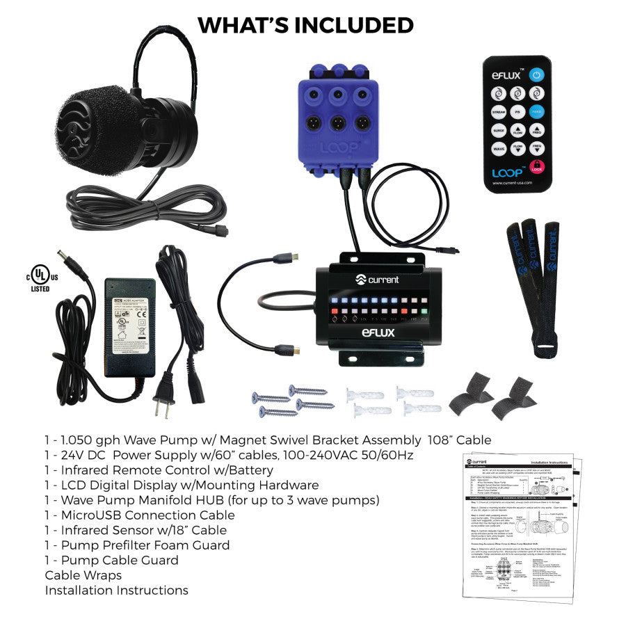 - Use Instructions: Step 1. Ensure all components are unpacked, unwrap cords and ensure there is no damage.Step 2. Choose a mounting location inside the aquarium vertical wall for your pump. Clean location of any dirt, algae or calcium deposits.Step 3. Install cable wrap wrapping around wave pump cable. This protects the pump cable from triggerfish, urchins and other animals that may damage pump cable. Place pump prefilter over pump end (optional).Step 4. Carefully separate magnet from pump and place pump into position in tank. Attach pump to tank using magnet. Swivel and adjust pump as desired.Installing Wave Pump Manifold Hub and Eflux Led Display.Step 5. Choose a location underneath your aquarium cabinet free of excessive moisture and/or saltwater creep. Note: if you want the eFlux wave pump LED display outside cabinet, ensure the mounting location is 6”-10” away from where the wave pump manifold HUB will be mounted.Step 6. Using included wood mounting screws, mount the eFlux wave pump HUB mounting bracket and eFlux pump LED display bracket to stand. Slide wave pump manifold HUB and pump LED display into each bracket.Step 7. Remove silicone caps from Pump #1 DC input and Pump #1 connection on manifold HUB. Attach caps to HUB mounting bracket. Keep other silicone caps in place if not in use.Step 8. Choose a location for the IR Sensor outside stand. The IR sensor is what receives control and on-demand command signals from the wireless remote. Unwrap cable and attach the IR sensor clip to your stand, attach IR sensor cable into the sensor clip. Ensure cable can reach wave pump manifold HUB.Step 9. Connect cables in the following order:a. Connect LED Display micro USB cable into Port#2b. Connect IR Sensor micro USB cable into Port#1c. Connect eFlux Wave Pump into P1 Pump Connectiond. Connect 24V DC cable into P1 Power DC inputStep 10. Plug 24V DC transformer into GFCI outlet. LED indicator light on manifold HUB will turn Blue.Step 11. Use velcro cable wraps (L) for excess cables.Step 12. Remove clear plastic tab from battery compartment on wireless remote control (H).Step 13. Press Main Power Key to turn pump ON. Pump will operate in default setting of Stream/Steady Flow Mode at 100% flow.