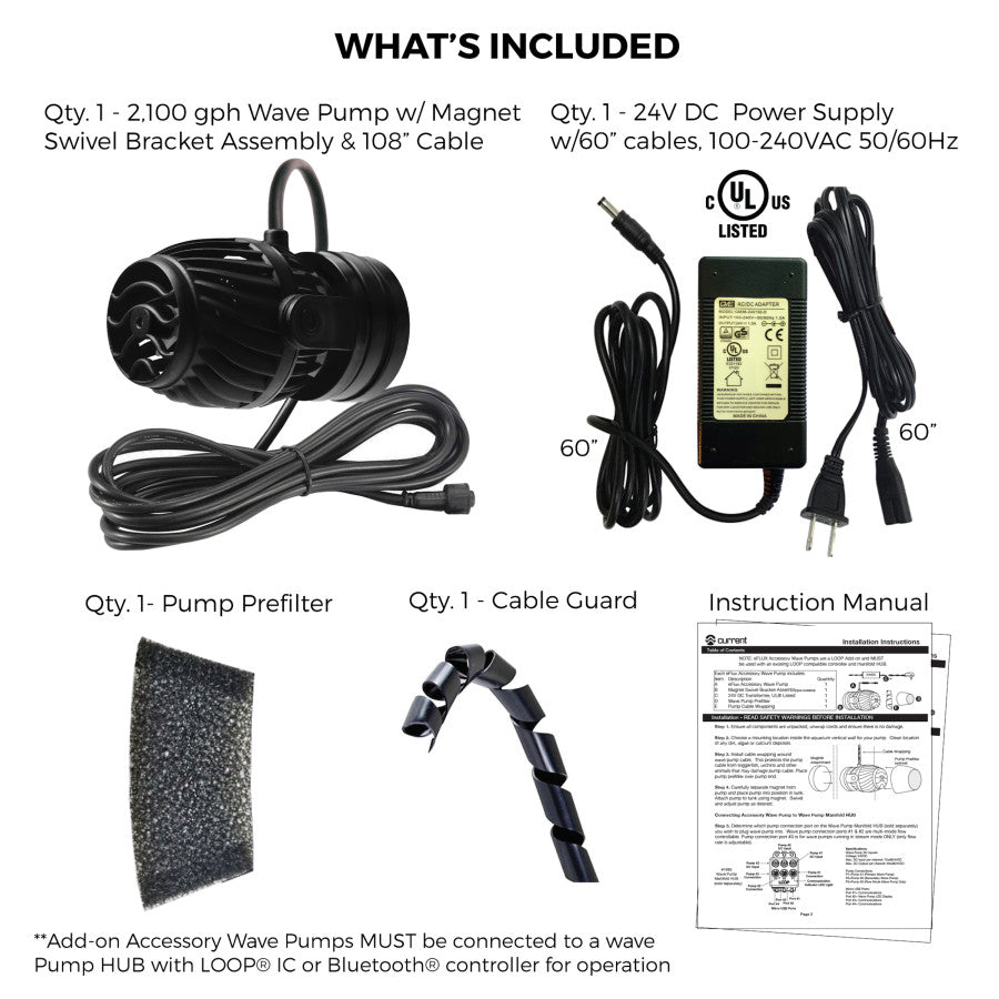 EFlux controllable wave pumps simulate water flow found in nature, providing tank wide circulation, improving water quality and promoting strong coral growth and fish health. Features include: Virtually silent, propeller style wave pump; Wireless control of flow speed and flow pattern; Easy-to-install magnetic swivel bracket assembly; Super safe low DC voltage; LOOP compatible - connects to other LOOP HUBS- Virtually silent, propeller style wave pump- Wireless control of flow speed and flow pattern- Easy magnetic swivel bracket assembly- Super safe, low DC voltage- Adjustable flow from 20% to 100%- Three flow modes: Stream, Surge, Wave- Additional Feed Mode shuts pumps off for feeding- Gyre mode synchronizes two pumps for gyre flow- Connects to any existing Orbit IC LED LOOP system or EFlux Wave Pump Kite Flux DC Controllable Wave Accessory Pumps include a super quiet 1050gph propeller wave pump, magnet attachment assembly with swivel bracket, foam filter, DC power supply and all connecting hardware. **Must be connected to an Orbit IC LED LOOP system or EFlux Wave Pump Kit for operation**