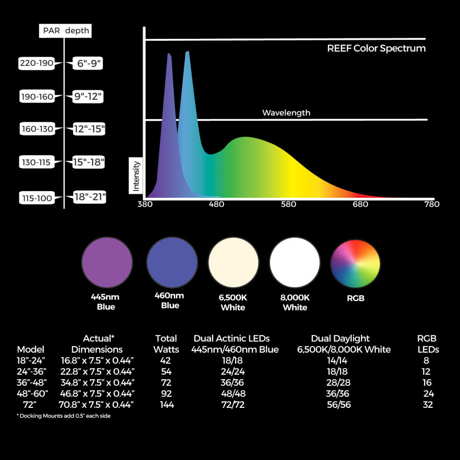 Delivering vivid colors and brightness, the Orbit Marine IC with wireless smartphone control is designed to make reefing easier and more enjoyable. From watching clouds gently roll across while listening to binaural ocean waves to producing pulsing waves, it completely changes your aquarium experience. Eye popping colors. A powerful blend of Dual Actinic blue 445nm/460nm, Dual Daylight white 6,700K/10,000K and RGB LEDs combined with 90 spherical optical lenses delivers the perfect blend of light for strong coral growth and amazing fluorescence.