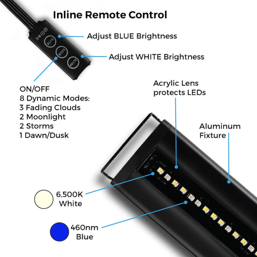 Super bright 6500K white LEDs and rich 445nm blue LEDs come together in an amazingly sleek fixture that's dialed-in for freshwater aquatic environments like nothing before. With independent control of the white and blue LEDs, you can select a color mode that bring favorites like cichlids, live bearers and tetras vivid life.
