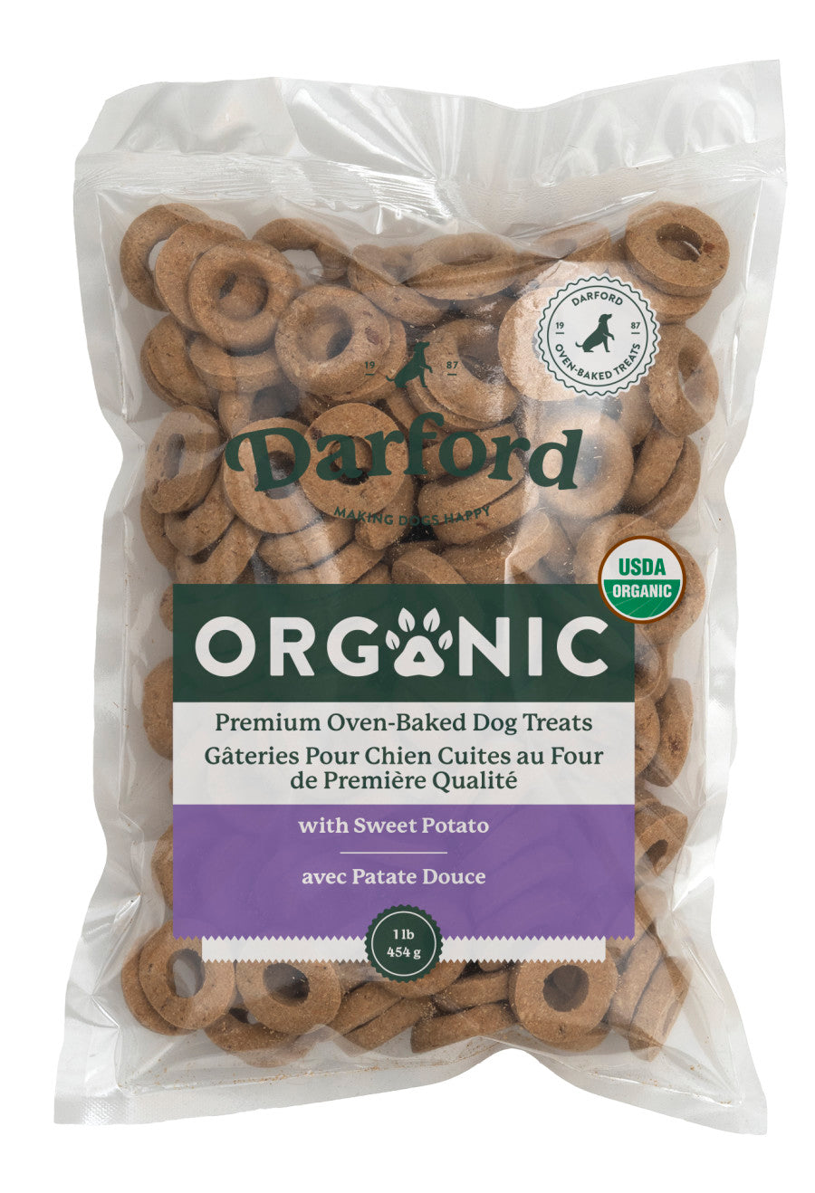 Darford ORGANIC with Sweet Potato. Contains Fiber - helps support a healthy digestion. USDA Certified Organic.Since 1987, we’ve been making small batches of ovenbaked dog treats. We only ever use the finest, all-natural quality ingredients. Our oven-baked promise means we don’t extrude at any point of the baking process, we don’t compromise on taste or quality, you even can see chunks of our whole natural ingredients in almost every treat. Our entire selection of treats are 100% free from artificial preservatives, colors and flavors. Scrumptious, Crunchy and Oh-So-Irresistible. Darford Oven-Baked Dog Treats. Keeping Tails Wagging since 1987.