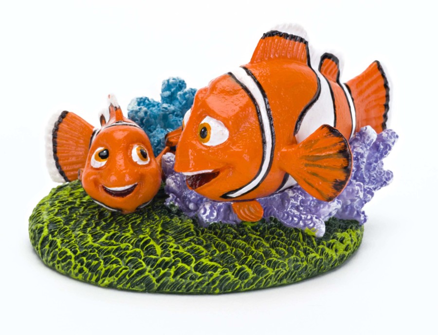 Capture the magic of Disney's Finding Dory at home in your aquarium! This brightly colored and meticulously hand painted aquarium ornament is cast in durable, non-toxic resin that is safe for all aquatic environments. It features Nemo (voiced by Hayden Rolence) and Marlin (voiced by Albert Brooks) swimming next to brightly colored purple and blue corals.