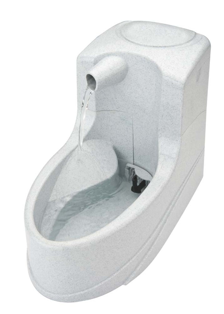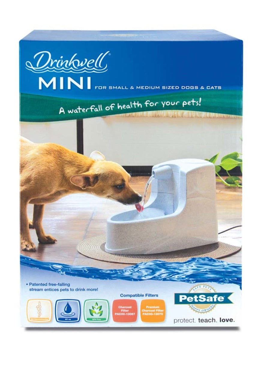 The Drinkwell Mini is the perfect fountain for small or medium dogs and cats. The Mini Fountain spouts 40 ounces of fresh, filtered water, giving your pet the option to drink from the flowing stream of water or the shallow bowl. Your pet's drinking water is filtered through the activated charcoal filter, keeping water clean and fresh-tasting. The patented free-falling stream of water adds oxygen, which keeps water naturally cool and encourages pets to drink more. The narrow, compact design is easy to fit in any room in your room, and the fountain comes apart for easy cleaning.