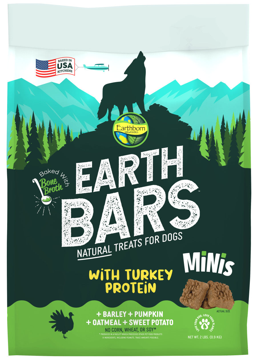 They may be mini, but we didn't skimp on the flavor. The same EarthBars your dog is sure to love, in a convenient, smaller size biscuit. Made with turkey protein, barley, pumpkin, and oatmeal, EarthBars are also infused with savory bone broth as a natural source of minerals and joint-supporting compounds to support gut health, joints, and skin.