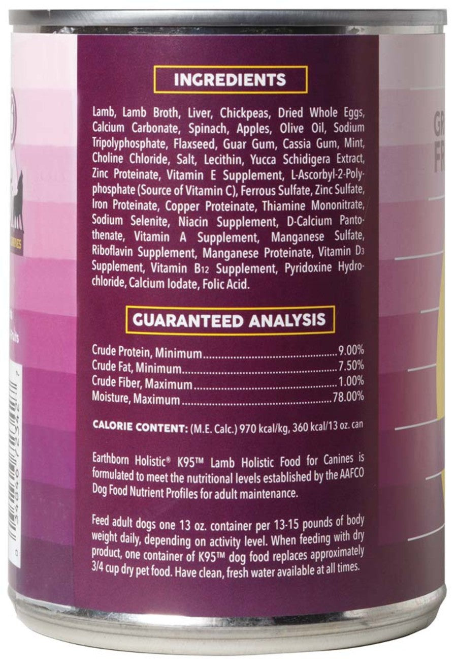 Earthborn Holistic K95 Lamb dog food is a single meat protein wet dog food made with real lamb protein. This grain- and gluten-free recipe is crafted with wholesome fruits and veggies and added essential vitamins and minerals. Our high protein K95 recipes can be served as a tasty stand-alone meal or as a topper or mixer added to your dog’s regular dinner.