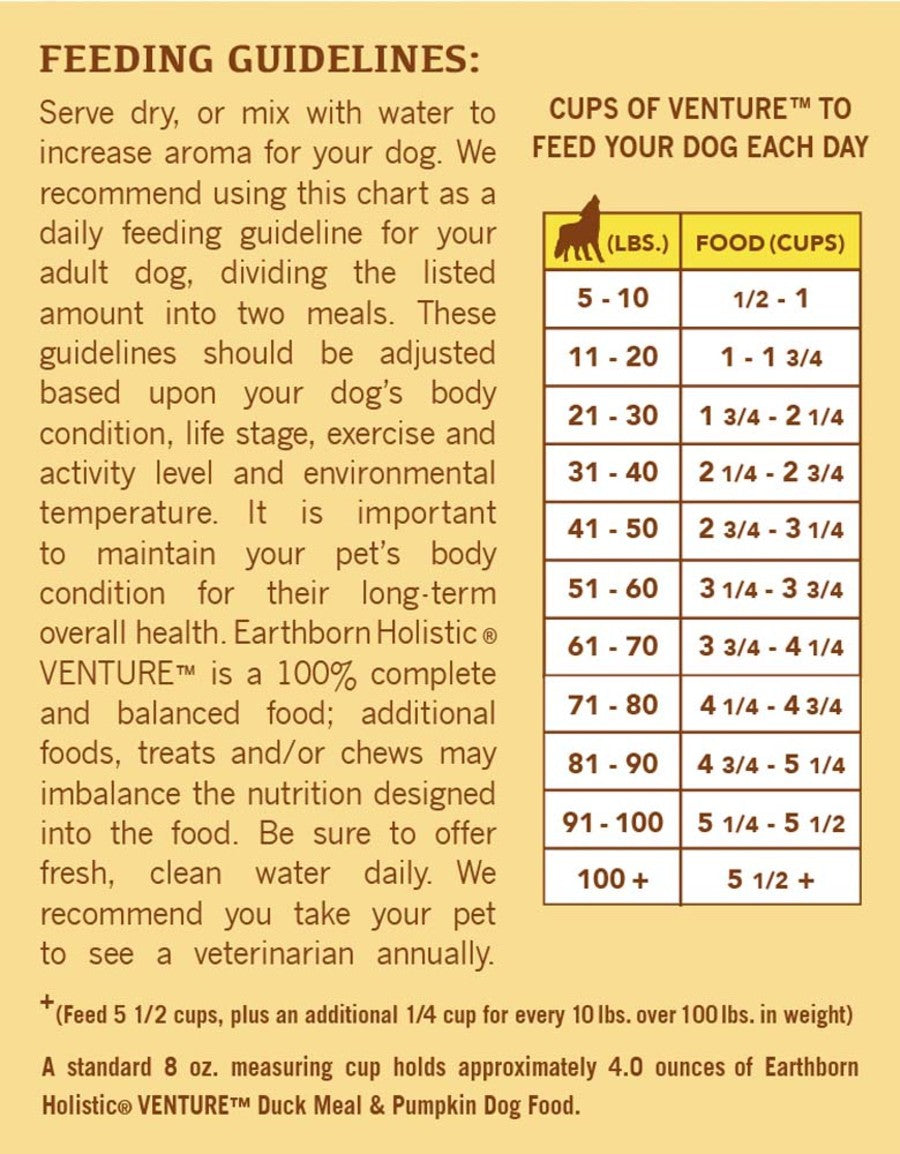 - Feeding Instructions: Serve dry, or mix with water to increase aroma for your dog. We recommend using this chart as a daily feeding guideline for your adult dog, dividing the listed amount into two meals. These guidelines should be adjusted based upon your dog’s body condition, life stage, exercise and activity level and environmental temperature. It is important to maintain your pet’s body condition for their long-term overall health. Earthborn Holistic® VENTURE™ is a 100% complete and balanced food; additional foods, treats and/or chews may imbalance the nutrition designed into the food. Be sure to offer fresh, clean water daily. We recommend you take your pet to see a veterinarian annually.Weight of Dog: 5 to 10 lbs. - Food Per Day: ½ to 1 cupWeight of Dog: 11 to 20 lbs. - Food Per Day: 1 to 1 ¾ cupsWeight of Dog: 21 to 30 lbs. - Food Per Day: 1 ¾ to 2 ¼ cupsWeight of Dog: 31 to 40 lbs. - Food Per Day: 2 ¼ to 2 ¾ cupsWeight of Dog: 41 to 50 lbs. - Food Per Day: 2 ¾ to 3 ¼ cupsWeight of Dog: 51 to 60 lbs. - Food Per Day: 3 ¼ to 3 ¾ cupsWeight of Dog: 61 to 70 lbs. - Food Per Day: 3 ¾ to 4 ¼ cupsWeight of Dog: 71 to 80 lbs. - Food Per Day: 4 ¼ to 4 ¾ cupsWeight of Dog: 81 to 90 lbs. - Food Per Day: 4 ¾ to 5 ¼ cupsWeight of Dog: 91 to 100 lbs. - Food Per Day: 5 ¼ to 5 ½ cups+ (Feed 5 1/2 cups, plus an additional 1/4 cup for every 10 lbs. over 100 lbs. in weight)A standard 8 oz. measuring cup holds approximately 4.0 ounces of Earthborn Holistic® VENTURE™ Duck Meal & Pumpkin Dog Food.