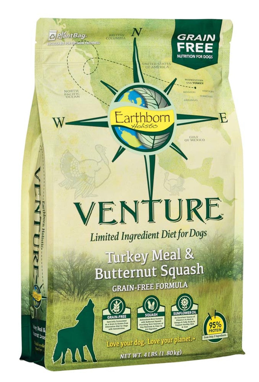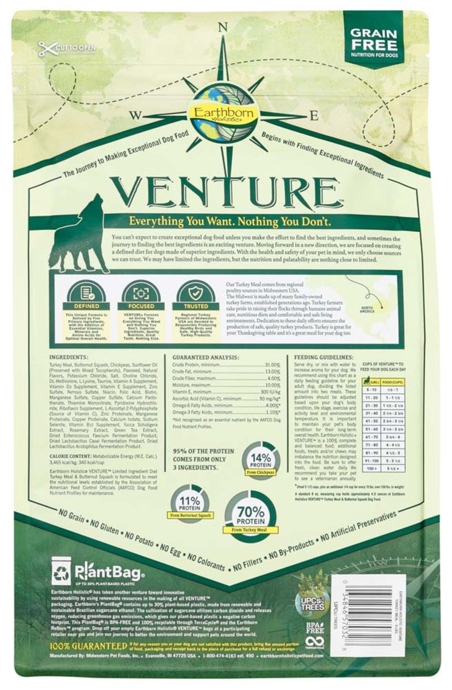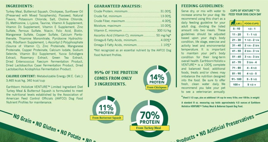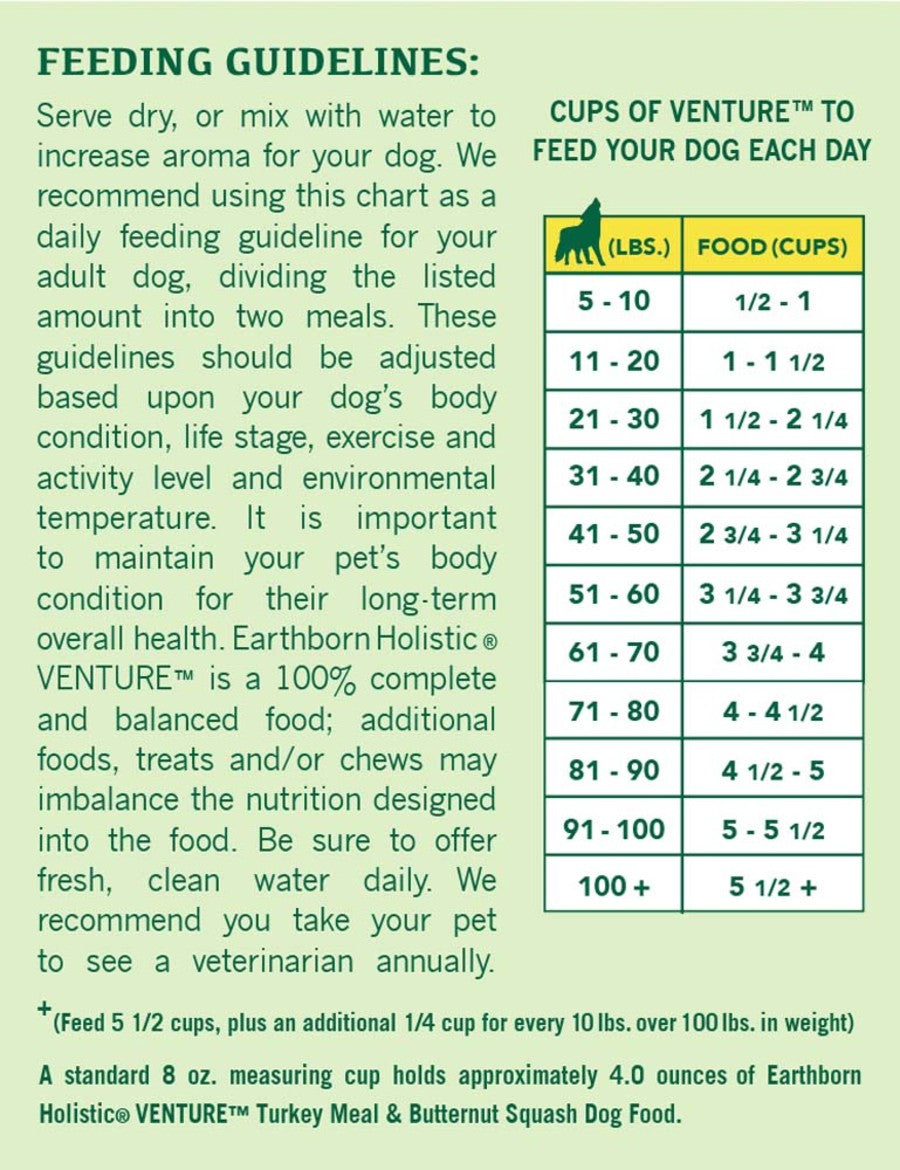 - Feeding Instructions: Serve dry, or mix with water to increase aroma for your dog. We recommend using this chart as a daily feeding guideline for your adult dog, dividing the listed amount into two meals. These guidelines should be adjusted based upon your dog’s body condition, life stage, exercise and activity level and environmental temperature. It is important to maintain your pet’s body condition for their long-term overall health. Earthborn Holistic® VENTURE™ is a 100% complete and balanced food; additional foods, treats and/or chews may imbalance the nutrition designed into the food. Be sure to offer fresh, clean water daily. We recommend you take your pet to see a veterinarian annually.Weight of Dog: 5 to 10 lbs. - Food Per Day: ½ to 1 cupWeight of Dog: 11 to 20 lbs. - Food Per Day: 1 to 1 ½ cupsWeight of Dog: 21 to 30 lbs. - Food Per Day: 1 ½ to 2 ¼ cupsWeight of Dog: 31 to 40 lbs. - Food Per Day: 2 ¼ to 2 ¾ cupsWeight of Dog: 41 to 50 lbs. - Food Per Day: 2 ¾ to 3 ¼ cupsWeight of Dog: 51 to 60 lbs. - Food Per Day: 3 ¼ to 3 ¾ cupsWeight of Dog: 61 to 70 lbs. - Food Per Day: 3 ¾ to 4 cupsWeight of Dog: 71 to 80 lbs. - Food Per Day: 4 to 4 ½ cupsWeight of Dog: 81 to 90 lbs. - Food Per Day: 4 ½ to 5 cupsWeight of Dog: 91 to 100 lbs. - Food Per Day: 5 to 5 ½ cupsWeight of Dog: 100+ lbs. - Food Per Day: 5 ½ cups ++ (Feed 5 1/2 cups, plus an additional 1/4 cup for every 10 lbs. over 100 lbs. in weight)A standard 8 oz. measuring cup holds approximately 4.0 ounces of Earthborn Holistic® VENTURE™ Turkey Meal & Butternut Squash Dog Food
