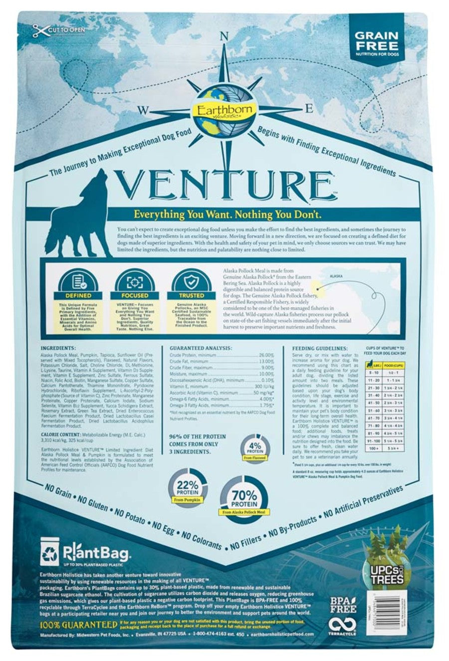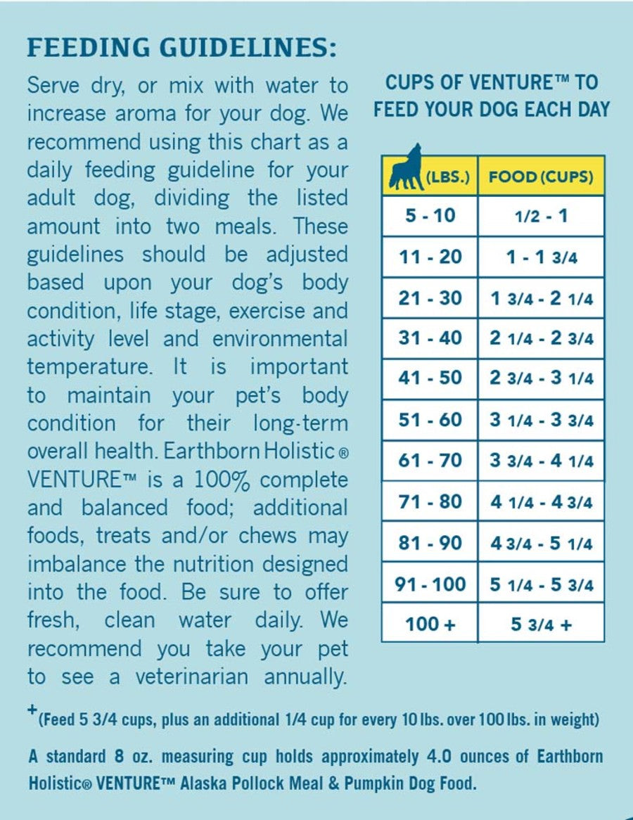 - Feeding Instructions: Serve dry, or mix with water to increase aroma for your dog. We recommend using this chart as a daily feeding guideline for your adult dog, dividing the listed amount into two meals. These guidelines should be adjusted based upon your dog’s body condition, life stage, exercise and activity level and environmental temperature. It is important to maintain your pet’s body condition for their long-term overall health. Earthborn Holistic® VENTURE™ is a 100% complete and balanced food; additional foods, treats and/or chews may imbalance the nutrition designed into the food. Be sure to offer fresh, clean water daily. We recommend you take your pet to see a veterinarian annually.Weight Of Dog: 5 to 10 lbs. - Food Per Day: ½ to 1 cupWeight Of Dog: 11 to 20 lbs. - Food Per Day: 1 to 1 ¾ cupsWeight Of Dog: 21 to 30 lbs. - Food Per Day: 1 ¾ to 2 ¼ cupsWeight Of Dog: 31 to 40 lbs. - Food Per Day: 2 ¼ to 2 ¾ cupsWeight Of Dog: 41 to 50 lbs. - Food Per Day: 2 ¾ to 3 ¼ cupsWeight Of Dog: 51 to 60 lbs. - Food Per Day: 3 ¼ to 3 ¾ cupsWeight Of Dog: 61 to 70 lbs. - Food Per Day: 3 ¾ to 4 ¼ cupsWeight Of Dog: 71 to 80 lbs. - Food Per Day: 4 ¼ to 4 ¾ cupsWeight Of Dog: 81 to 90 lbs. - Food Per Day: 4 ¾ to 5 ¼ cupsWeight Of Dog: 91 to 100 lbs. - Food Per Day: 5 ¼ to 5 ¾ cupsWeight Of Dog: 100+ lbs. - Food Per Day: 5 ¾ cups ++ (Feed 5 3/4 cups, plus an additional 1/4 cup for every 10 lbs. over 100 lbs. in weight)A standard 8 oz. measuring cup holds approximately 4.0 ounces of Earthborn Holistic® VENTURE™ Alaska Pollock Meal & Pumpkin Dog Food.