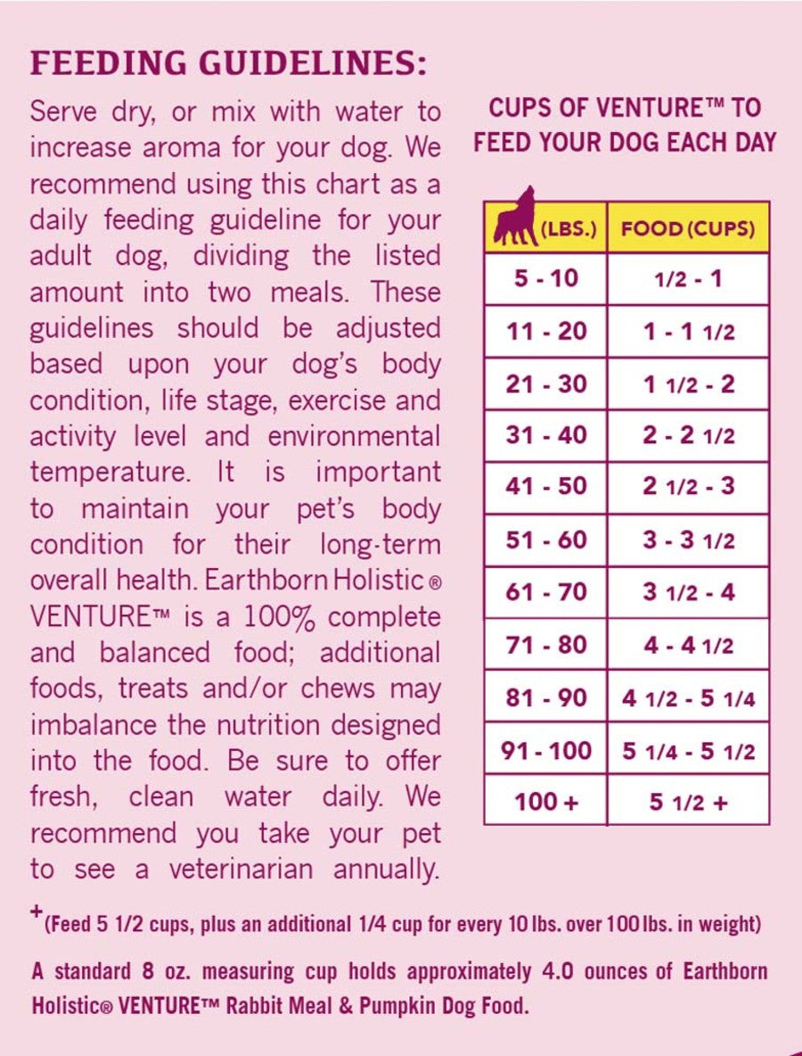 - Feeding Instructions: Serve dry, or mix with water to increase aroma for your dog. We suggest using these charts as a guide. Please remember these portions are averages and will vary according to your dog’s body condition, age, activity level and environment. When introducing VENTURE, mix increasing amounts of VENTURE withdecreasing amounts of the current food over a 7-10 day period. This transition will help reduce digestive upsets that might occur due to the change in diet. During gestation and lactation, feed 2 to 4 times as much food as recommended in the Adult Feeding Guide for the weight of your adult dog. Puppies start to eat solid foods at three to four weeks of age and can be fed dry or with warm water (3 parts food - one part water). Be sure to offer fresh, clean water daily. We recommend taking your pet to see a veterinarian annually.Cups of VENTURE™Rabbit Meal & Pumpkin to Feed Your Adult Dog Each Day!Weight Of Dog: 5 to 10 lbs. - Food Per Day: ½ to 1 cupWeight Of Dog: 10 to 20 lbs. - Food Per Day: 1 to 1 ¾ cupsWeight Of Dog: 20 to 30 lbs. - Food Per Day: 1 ¾ to 2 ¼ cupsWeight Of Dog: 30 to 40 lbs. - Food Per Day: 2 ¼ to 2 ¾ cupsWeight Of Dog: 40 to 50 lbs. - Food Per Day: 2 ¾ to 3 ¼ cupsWeight Of Dog: 50 to 60 lbs. - Food Per Day: 3 ¼ to 3 ¾ cupsWeight Of Dog: 60 to 70 lbs. - Food Per Day: 3 ¾ to 4 cupsWeight Of Dog: 70 to 80 lbs. - Food Per Day: 4 to 4 ½ cupsWeight Of Dog: 80 to 90 lbs. - Food Per Day: 4 ½ to 5 cupsWeight Of Dog: 90 to 100 lbs. - Food Per Day: 5 to 5 ½ cupsWeight Of Dog: 100+ lbs. - Food Per Day: 5 ½ cups + (1/4 cup for every 10 lbs. over 100 lbs. in weight)Cups of VENTURE™Rabbit Meal & Pumpkin To Feed Your Puppy Each Day!Age: Up to 4 months, 2 to 10 lbs: ½ - 2 cups, 10 to 20 lbs: 2 - 3 cups, 20 to 40 lbs: 3 to 5 cups, 40 to 60 lbs: 5 to 6 ½ cups, 60 to 80 lbs: 6 ½ - 8 cupsAge: 4 to 8 months, 2 to 10 lbs: 1/3 - 1 ½ cups, 10 to 20 lbs: 1 ½ - 2 ½ cups, 20 to 40 lbs: 2 ½ - 3 ¾ cups, 40 to 60 lbs: 3 ¾ to 5 cups, 60 to 80 lbs: 5 to 6 ½ cups, 80 to 100 lbs: 6 ½ to 7 ½ cups, 100 to 120 lbs: 7 ½ to 8 ¾ cups, 120+ lbs: 8 ¾ cups + 1 cup for every 20 lb. over 120 lb.Age: 8 to 12 months, 2 to 10 lbs: 1/3 - 1 ¼ cup, 10 to 20 lbs: 1 ¼ - 2 cups, 20 to 40 lbs: 2 - 3 cups, 40 to 60 lbs: 3 to 4 ¼ cups, 60 to 80 lbs: 4 ¼ - 5 ½ cups, 80 to 100 lbs: 5 ½ to 6 ½ cups, 100 to 120 lbs: 6 ½ to 7 cups, 120+ lbs: 7 cups + ¾ cup for every 20 lb. over 120 lb.A standard 8 oz. measuring cup holds approximately 4.0 ounces of Earthborn Holistic® VENTURE™ Rabbit Meal & Pumpkin Dog Food.