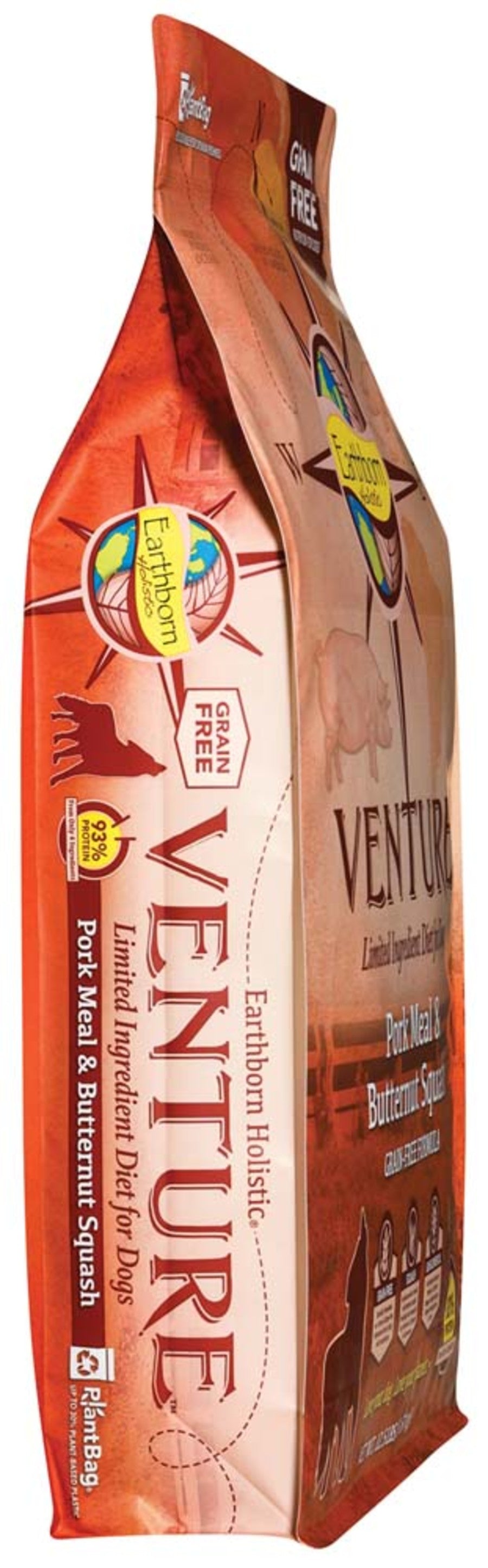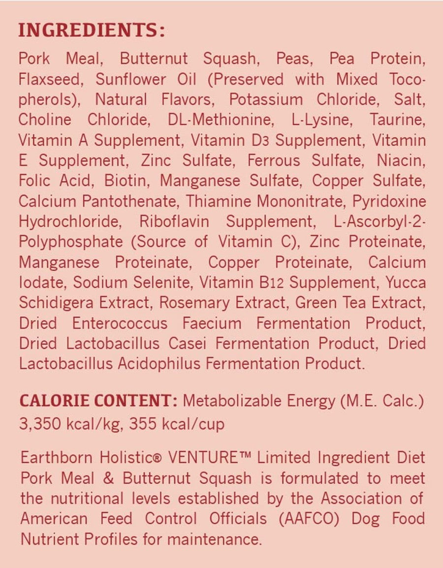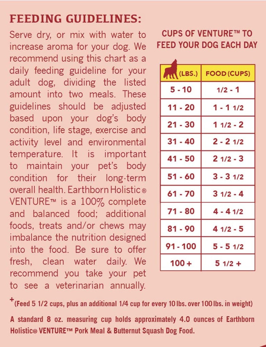 - Feeding Instructions: Serve dry, or mix with water to increase aroma for your dog. We recommend using this chart as a daily feeding guideline for your adult dog, dividing the listed amount into two meals. These guidelines should be adjusted based upon your dog’s body condition, life stage, exercise and activity level and environmental temperature. It is important to maintain your pet’s body condition for their long-term overall health. Earthborn Holistic® VENTURE™ is a 100% complete and balanced food; additional foods, treats and/or chews may imbalance the nutrition designed into the food. Be sure to offer fresh, clean water daily. We recommend you take your pet to see a veterinarian annually.Weight of Dog: 5 to 10 lbs. - Food Per Day: ½ to 1 cupWeight of Dog: 11 to 20 lbs. - Food Per Day: 1 to 1 ½ cupsWeight of Dog: 21 to 30 lbs. - Food Per Day: 1 ½ to 2 cupsWeight of Dog: 31 to 40 lbs. - Food Per Day: 2 to 2 ½ cupsWeight of Dog: 41 to 50 lbs. - Food Per Day: 2 ½ to 3 cupsWeight of Dog: 51 to 60 lbs. - Food Per Day: 3 to 3 ½ cupsWeight of Dog: 61 to 70 lbs. - Food Per Day: 3 ½ to 4 cupsWeight of Dog: 71 to 80 lbs. - Food Per Day: 4 to 4 ½ cupsWeight of Dog: 81 to 90 lbs. - Food Per Day: 4 ½ to 5 cupsWeight of Dog: 91 to 100 lbs. - Food Per Day: 5 to 5 ½ cupsWeight of Dog: 100+ lbs. - Food Per Day: 5 ½ cups++ (Feed 5 1/2 cups, plus an additional 1/4 cup for every 10 lbs. over 100 lbs. in weight)A standard 8 oz. measuring cup holds approximately 4.0 ounces of Earthborn Holistic® VENTURE™ Pork Meal & Butternut Squash Dog Food.