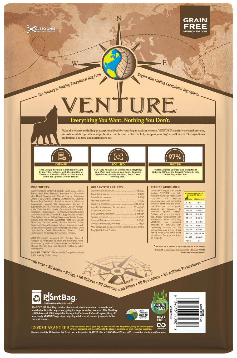 Venture Smoked Bison & Pumpkin is a limited-ingredient dog food recipe crafted with fresh bison and vine-ripened pumpkins. These limited ingredient diets are made with butternut squash, tapioca, sunflower oil, and flaxseed and is mixed with a lineup of essential vitamins and nutrients to help dogs with allergies or sensitivities receive great nutrition.
