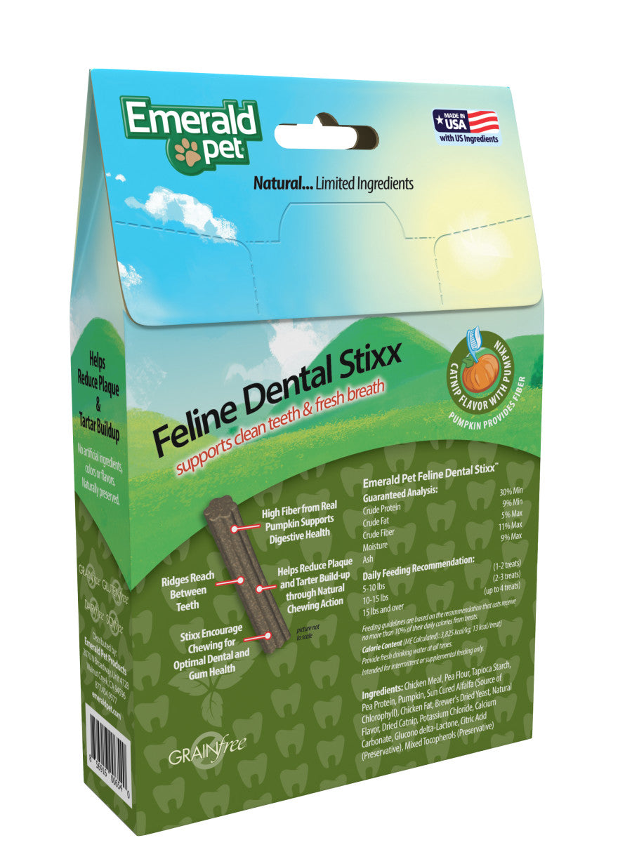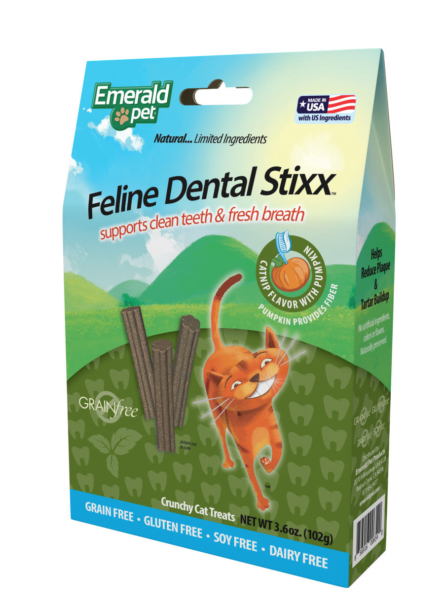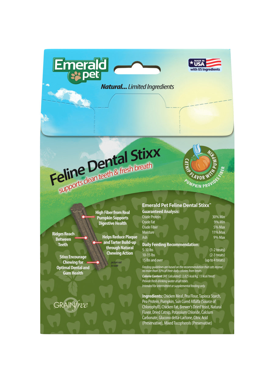 Emerald Pet Feline Dental Stixx are the natural solution for proper teeth cleaning and rewarding. The unique shape and texture with ridges reach the back teeth while massaging the gums for optimal dental care. Real pumpkin is known to soothe tummies and provide fiber for natural digestive health. Each stick is unique in shape, entertaining your cat as they bat Stixx around with their paws and bite their crunchy reward! Each piece is approximately 1.75″ in length, creating the ideal size and calorie content for treating.