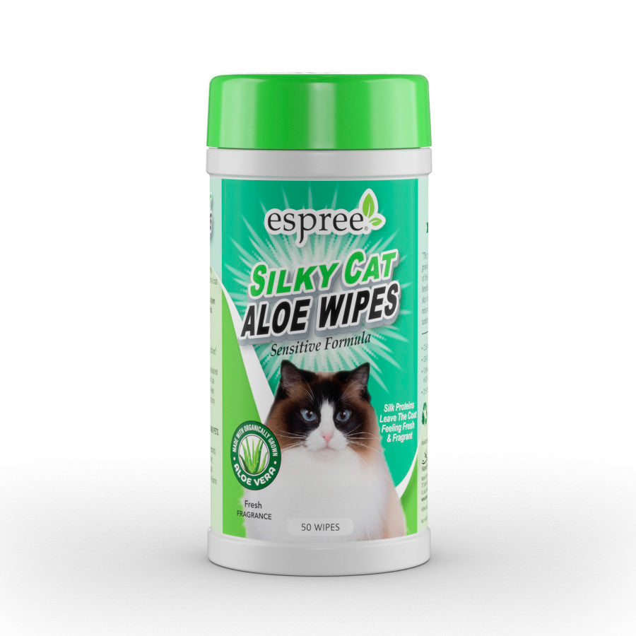 When your cat will not allow a shampoo bath. Espree Silky Cat Aloe Wipes are the perfect solution for easy cleaning of face, paws, or coat. Our mild pH balanced formula is infused with organically is infused with organically grown aloe Vera to clean & moisturize skin and coat. Silk Proteins provide a silky shine finish. Perfect for removing odor, food, dirt debris, dander and potty mishaps.