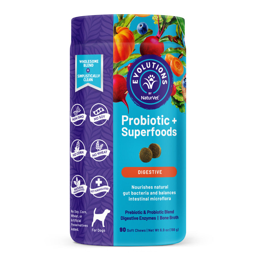 NaturVet Evolutions Probiotic + Superfoods Soft Chews offer advanced probiotics, prebiotic, enzymes, and superfoods to support overall wellness and the entire digestive tracts. Evolutions soft chews feature wholesome blends of advanced formulas and nutrient rich ingredients.