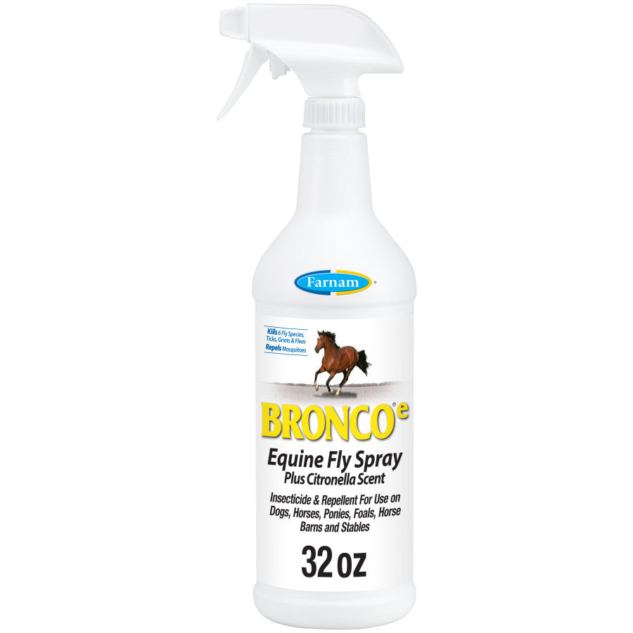When it comes to fly control, Bronco®e Equine Fly Spray is a staple for every stable! Horse owners know it takes more than a few different tricks and products to maintain a true No-fly Zone. The good news is that one of the most flexible options available to you also happens to be one of the most cost-effective! With Bronco®e Equine Fly Spray you’re getting one product that will quickly become your go-to solution for multiple challenges. Use Bronco®e Equine Fly Spray to provide protection for your horses, stables and even your dogs all in one convenient bottle. The spray kills six types of flies (stable, horse, face, deer, house and horn), gnats, ticks, fleas, chiggers, and lice, and repels bloodsucking mosquitoes. The water-based formula is non-oily and leaves behind a pleasant citronella scent that continues to keep bugs away. Apply it as a light spray or as a wipe on horses, ponies, foals and in horse barns and stables in need of fly protection. You can also choose the gallon size as a premise spray (with a tank sprayer) throughout the barn (or your horse trailer) to kill and repel flying insects. Bronco®e Equine Fly Spray is your efficient, effective and economical answer to multi-purpose fly prevention. Bugs don't fly with Farnam, your partner in horse care.