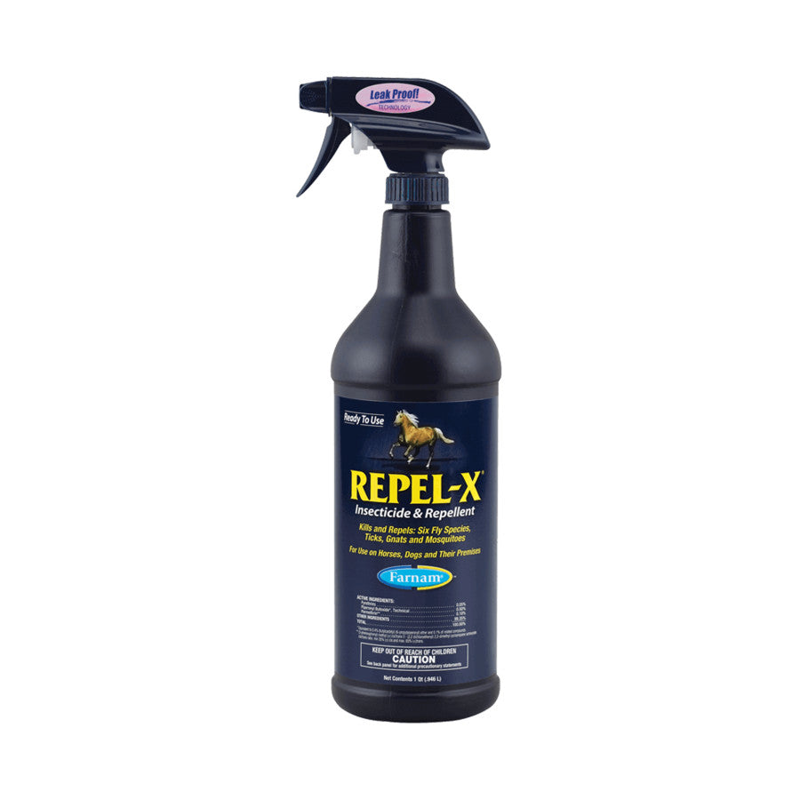 Horse health is important. Repel-X horse fly repellent is the best selling horse fly spray from Farnam for a reason. Actually, make that three great reasons! Repel-X is Farnam's practical, budget-friendly fly repellent for horses, dogs and their premises... all these uses in just one bottle! Farnam Repel-X Insecticide and Repellent is ready-to-use so there is no mixing with water required. Just spray and go! Repel-X was the first fly repellent on the market in 1957 and continues to remain a horse owner's favorite equine fly spray today. The easy-to-use, water-based formula kills and repels six fly species, plus ticks, gnats and mosquitoes. It is an excellent tick repellent for horses and fly spray for dogs. This hard working spray with multiple uses is the one bottle you need in your barn for horse pest control.