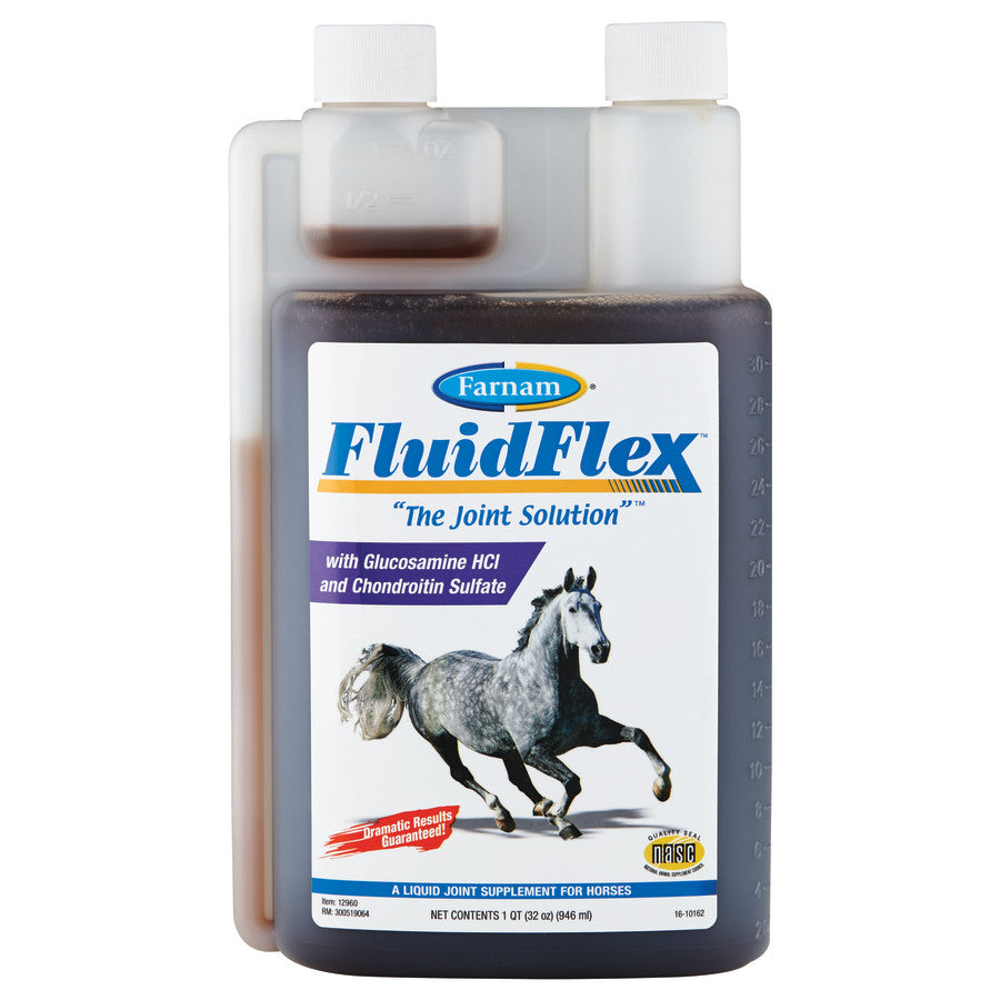 When you ride your horse regularly, whether for pleasure, trail riding or competition, his joints are put to the test. Keeping a horse sound takes proactive management, including balanced nutrition, possible joint supplementation and routine hoof care. Movement is vital to a horse's longevity; without healthy joints, a horse can become stiff, sore and begin to breakdown. Help keep horses in motion with the exclusive formula of FluidFlex Liquid Joint Supplement. Known as The Joint Solution for a reason; it contains the most preferred ingredients for healthy joint and hip function. Combines a balance of glucosamine HCl, which supports the production of cartilage and helps manage inflammation due to exercise and overexertion; chondroitin sulfate, which supports the production of proteoglycans; and potent antioxidants to help keep horses sound and discourage soreness. This daily joint supplement is easy-to-give; simply pour over grain ration or dose with an oral syringe. Dramatic results are guaranteed!