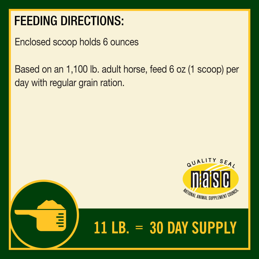- Feeding Instructions: Enclosed scoop holds 6 oz.Based on 1,100 lb. horse, feed 6 oz. (1 scoop) per day.
