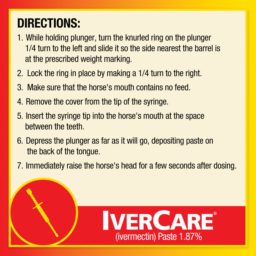 - Use Instructions: This syringe contains sufficient paste to treat one 1,500 lb horse at the recommended dose rate of 91 mcg ivermectin per lb (200 mcg/kg) body weight. Each weight marking on the syringe plunger delivers enough paste to treat 250 lb body weight.1. While holding the plunger, turn the knurled ring on the plunger 1/4 turn to the left, and slide it so the side nearest the barrel is at the prescribed weight marking.2. Lock the ring in place by making a 1/4 turn to the right.3. Make sure that the horse's mouth contains no feed.4. Remove the cover from the tip of the syringe.5. Insert the syringe tip into the horse's mouth in the space between the teeth.6. Depress the plunger as far as it will go, depositing paste on the back of the tongue.7. Immediately raise the horse's head for a few seconds after dosing.From the manufacturer: IverCare® (ivermectin paste) 1.87% is FDA-Approved for equine use only, and only pursuant to, and in accordance with, its label. It is only effective for the approved indications on the label. This product has not been tested in humans and is not approved for use with humans. Any and all off-label use is unsafe and is strictly prohibited.