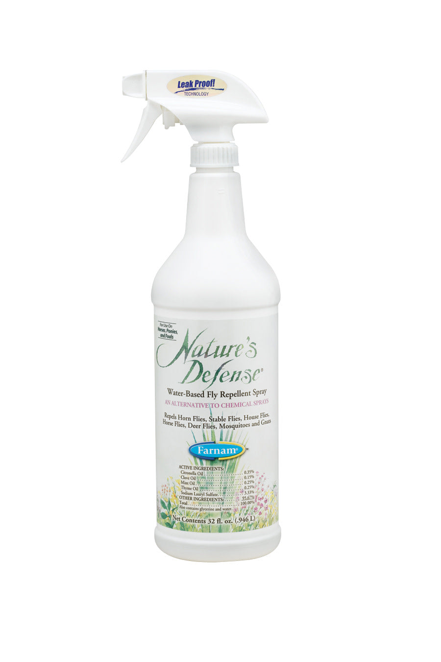 Nature's defense water-based Fly repellent spray offers a fresh alternative for pest control. Combines Citronella with other botanicals for effective control against five types of flies, mosquitoes and gnats. Contains no preservatives, additives or artificial colors. Feel good about making a natural product part of your Fly control Program. Repels horn, stable, house, horse and deer flies, plus mosquitoes and gnats alcohol-free formula won't irritate sensitive skin contains Citronella oil, clove oil, mint oil, thyme oil and sodium lauryl SULFATE available in ready-to-use 32 oz. Spray or 32 oz. Concentrate that make 5 quarts.