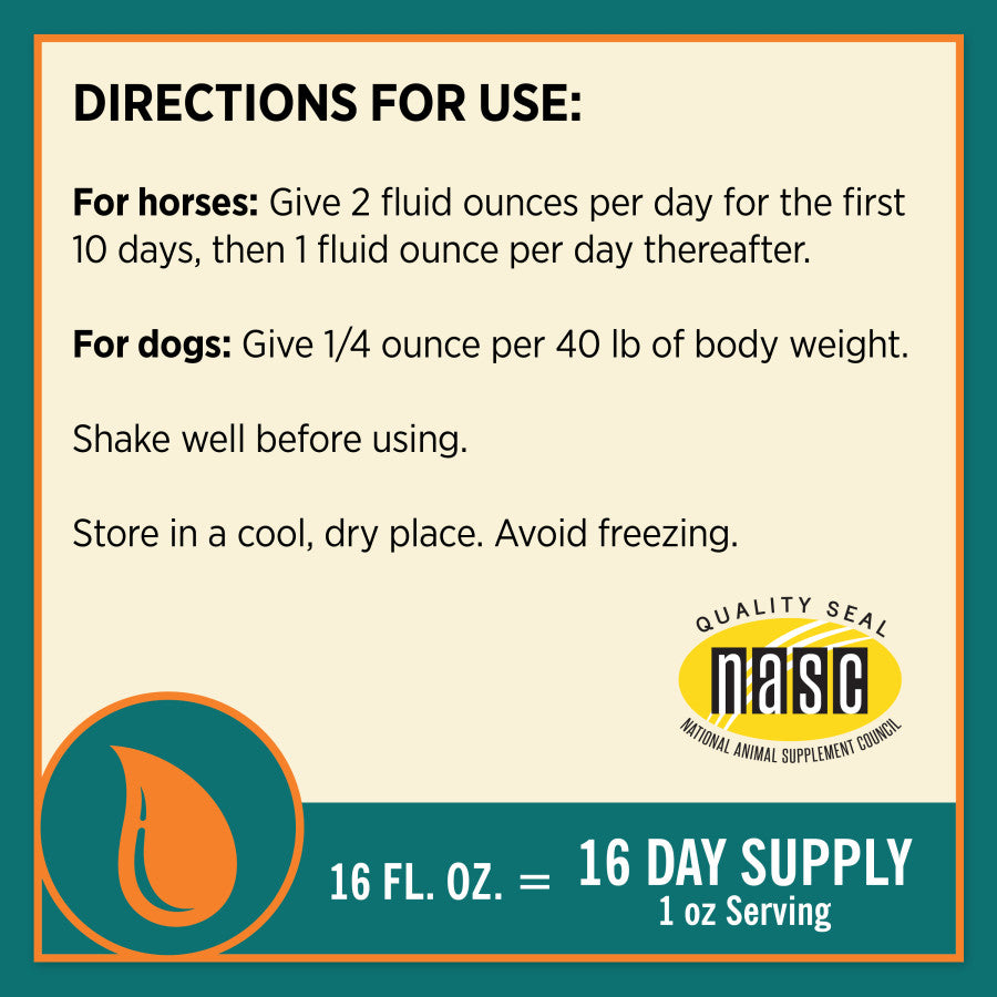 - Use Instructions: For horses: Give 2 fl oz per day for the first 10 days, then 1 fl oz per day thereafter. For dogs: Give 1/4 oz per 40 lb of body weight. Shake well before using. Store in a cool, dry place.