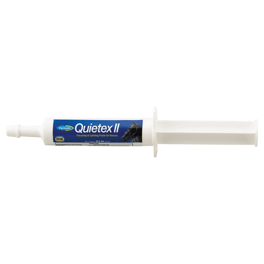 There are many different reasons why a horse may appear to have behavioral issues and struggle with even the most basic tasks. It can be hard for a horse to focus when he's nervous or stressed out. Horses that are naturally high-strung or easily stressed can act nervous, tense, spooky, inattentive or reactive under saddle or in day-to-day situations, and may need additional support to help keep them relaxed. If you have a nervous or flighty horse, you’ve probably wondered if there was a way to take the edge off without resorting to drugs. Help promote calmness and relaxation during training sessions, events, trail rides, trailering or other stressful situations* with Quietex II Focusing & Calming Paste. Trusted formula contains a unique combination of six stress-relieving ingredients - L-Tryptophan, Thiamine, Inositol, Magnesium, Vitamin B6 and Valerian Root - that help manage stress and nervous behavior without drugs or sedatives. Won't cause drowsiness or affect performance, so your horse stays alert, focused and able to concentrate on the task at hand. This convenient, easy-to-give paste provides an immediate serving of calming ingredients, making it ideal for trailering, long trail rides and veterinarian or farrier visits. *Check with your association for testing rules and regulations