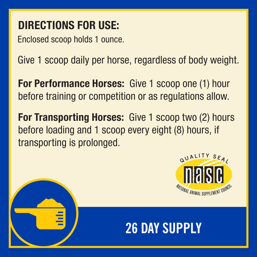 - Use Instructions: Administer the contents of the syringe directly into the horse’s mouth and when possible to the back of the tongue. For Performance Horses: 1 full syringe 2 hours before training or competition or as regulations allow. For Transporting Horses: 1 full syringe 2 hours before loading and 1 full syringe every 8 hours if transporting is prolonged.