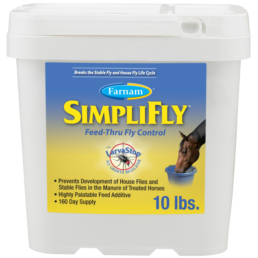 - Use Instructions: DO NOT USE ON HORSES INTENDED FOR SLAUGHTERFeed the recommended dosage of Farnam® SimpliFly® Feed-Thru Fly Control to each horse separately to make certain he receives his full portion. This product should be fed top dressed on grain or mixed with the horse's total ration to provide 6.8 mg of diflubenzuron per 100 lbs. of body weight. For an occasional finicky eater who does not accept new feeds readily, mix this product with sweet feed or grain ration.Start feeding Farnam® SimpliFly® Feed-Thru Fly Control early in the spring before flies begin to appear and continue feeding throughout the summer and into the fall until cold weather restricts fly activity. This product contains an insect growth regulator which prevents the development of house flies and stable flies in the manure of treated horses, but is not effective against existing adult flies.In some cases, supplemental fly control measures may be needed in and around paddocks and buildings to control adult house and stable flies which can breed in other decaying vegetable matter or silage on premises, or that migrate in from other areas.Farnam® SimpliFly® Feed-Thru Fly Control should be used as part of an integrated pest management program aimed at reducing fly populations in the horse's environment. Consult your retailer for program recommendations. In order to achieve optimum fly control, this product should be used in conjunction with other premise and on-animal products as well as good management and sanitation practices.