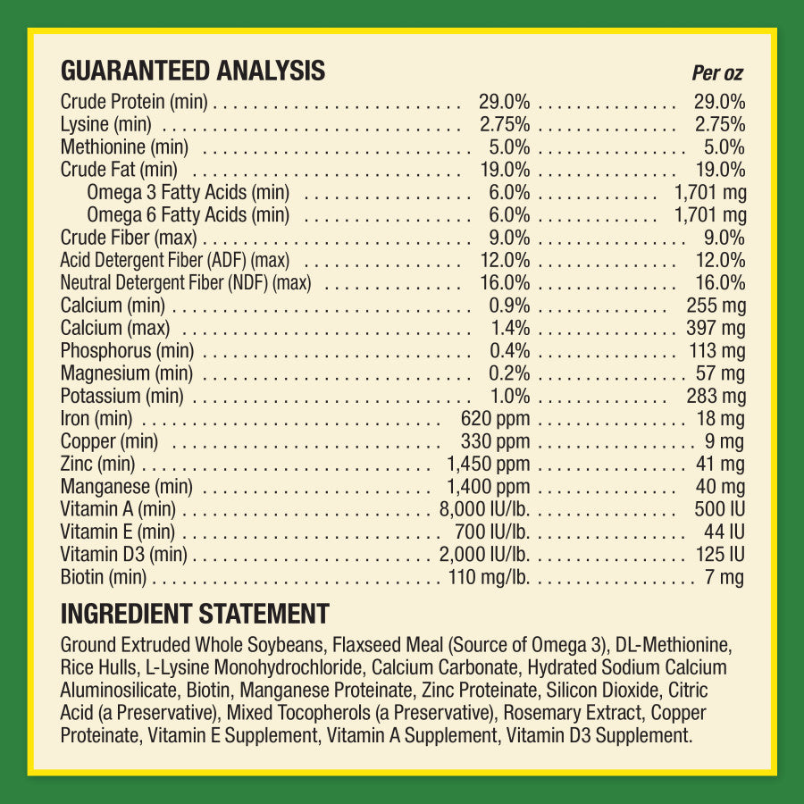 - Improved formula contains a balance of omega 3 & omega 6 fatty acids from flaxseed & soybean meal