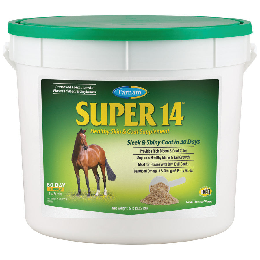 Help your horse look and feel his best! Super 14™ Healthy Skin & Coat Supplement is nutritionally formulated with fatty acids, amino acids, biotin, zinc, vitamins & minerals to promote rich color, beautiful glossy coat and a lustrous mane & tail. Improved formula contains omega 3 and omega 6 fatty acids from flaxseed and soybean meal to keep coats shiny and gleaming year-round. Helps maintain normal moisture content of the skin and supports normal shedding. Perfect for coats, manes and tails of every color!