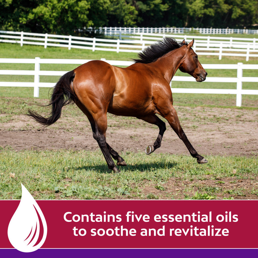 Just like us, daily exercise takes its toll on your horse’s muscles. Overtime, discomfort and inflammation can lead to injury if left untreated. You want a solution that works as hard as your horse to keep them comfortable while they reset and get back to their best. Vetrolin Liniment provides relief and relaxation after physical activity, helping to reduce swelling and inflammation to aid in a comfortable recovery. In addition to providing soothing relief, this liniment stimulates blood flow to sore ankles, knees and tendons to help recovery. Keeping your horse happy and comfortable while their body is sore or stressed from exercise can make the difference in getting them back to their best quickly. Made with five essential oils and the signature herbal scent of Vetrolin, this liniment ensures a calming and therapeutic end to a long day of activity that you and your horse can both enjoy. Whether it’s for daily exercise, work around the farm or for competition, help your horse feel as fresh at the end of the day as they did at the start. Versatile and economical, Vetrolin Liniment is a concentrated formula that can be diluted for use as a body wash or as a delightfully refreshing post-workout body brace. Give your horse the relief and recovery they deserve with Vetrolin Liniment.