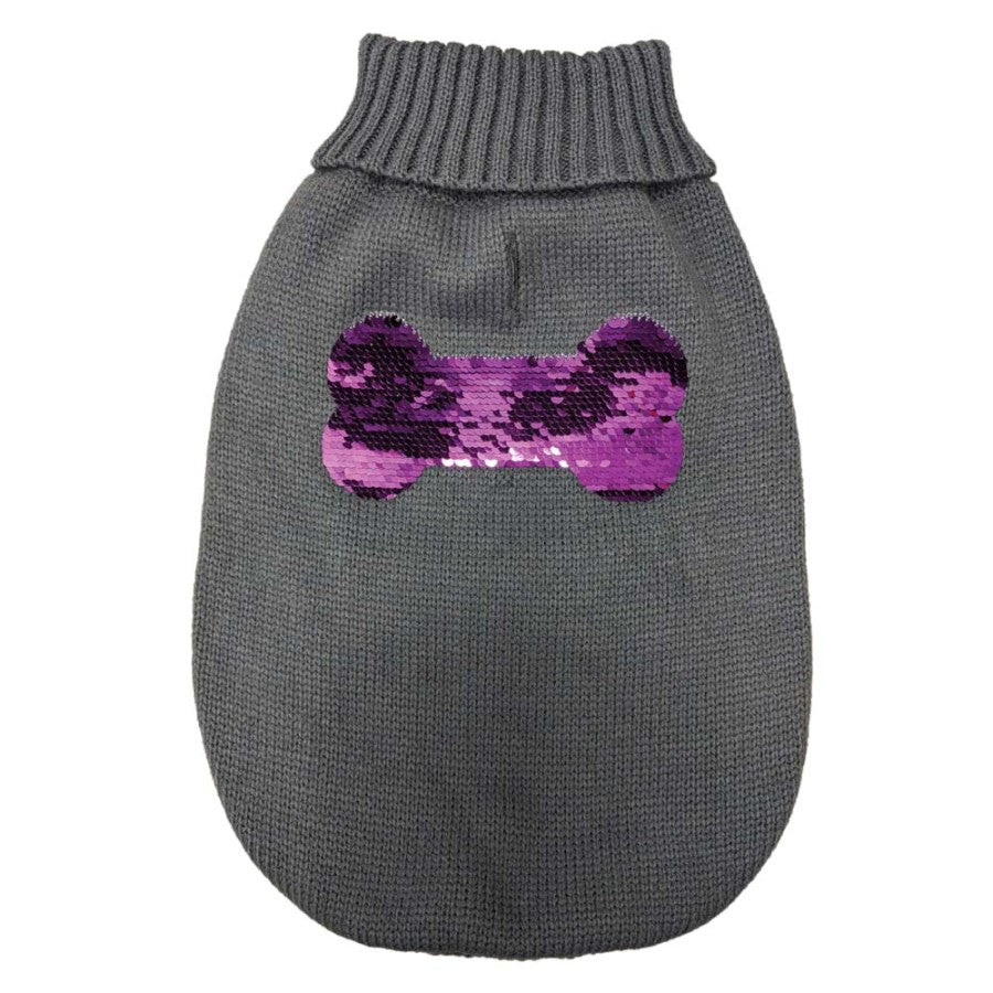 Fashionable Gray sweater with bone using reversible sequins for added bling! Brush sequins up and down to reveal two colors purple and silver. Foldover collar and leash hole.