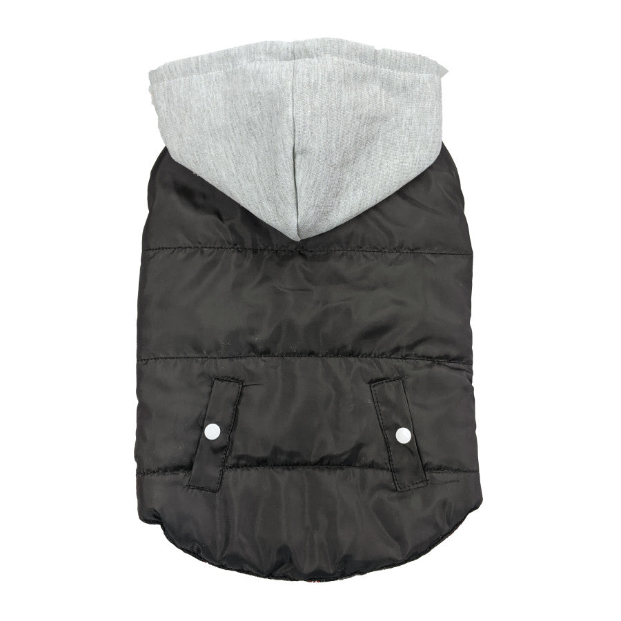 Basic styling with a twist. Reverses to plaid. 2 looks in 1! Double layer hood gives your pet a trendy athletic look. Leash hole.