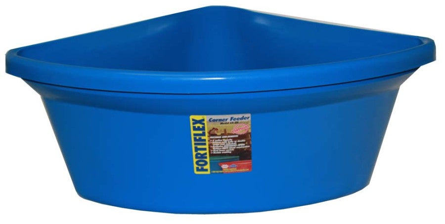 Fortiflex Heavy Duty Large 24Qt Capacity Corner Feeder. One-Piece Construction Suitable For Water Or Feed. Real Brass Eyelets To Fasten Into Corner With Bolts Or Double-End Snaps. Front Lip Helps Keep Feed Inside. Green