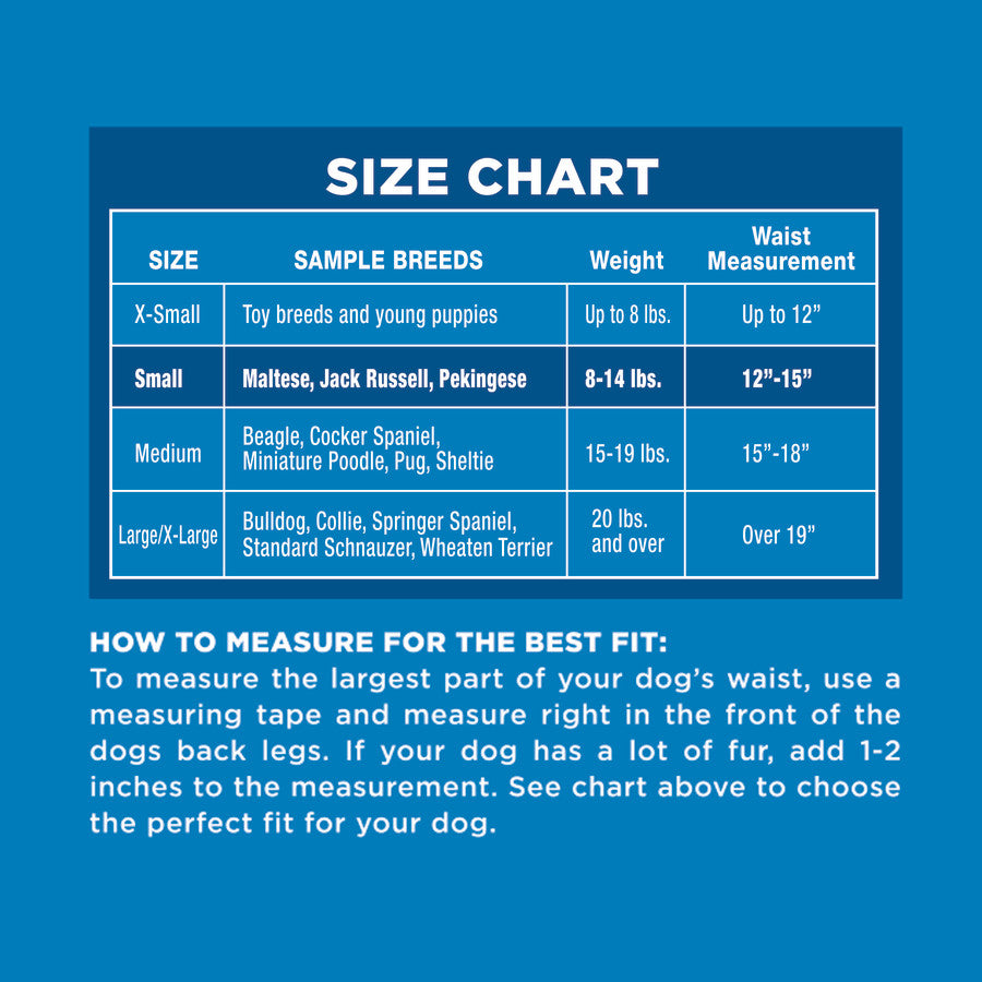 Keep your dog dry and your home clean with Wee-Wee Disposable Dog Diapers. These highly absorbent diapers are specially designed with a Foam-Fit Tail Hole and leak-guard flaps to provide a snug, comfortable fit and leak protection for 12 hours. This unique feature ensures the diaper stays put and dog waste stays where it belongs—even on the most enthusiastic tail-waggers! For added ease, the diaper's flex-fit design is double-stitched and conforms to your furry friend's body for extra comfort, protection, and peace of mind. Plus, each diaper has repositionable fasteners that won't tear. Always know when it is time for a fresh diaper with the helpful Fashion Paws Wetness Indicator. When the blue pawprint design fades, it is time for a change! Perfect for both male and female dogs, these disposable diapers for dogs are great for potty training, females in season, dogs with incontinence, senior dogs, excitable urination, and more.