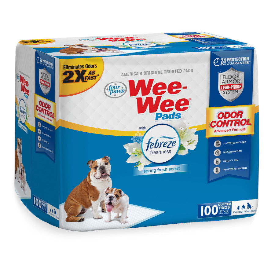 Every pet parent and dog deserve a clean and fresh-smelling home! That's why Four Paws partnered with Febreze to create the ultimate odor-eliminating dog training pads. We infused our Wee-Wee Odor Control Pads with Febreze Freshness, which neutralizes strong ammonia odors and provides a fresh spring scent. In fact, these scented dog pads eliminate pet odors 2X faster than standard 5-layer Wee-Wee pads. Plus, the 7-layer, leak-proof technology with oversized quilted pockets guarantees 24-hour wetness protection. Whether you're training a puppy or just need a comfortable indoor potty spot for your best friend, each pad measures 22 inches x 23 inches and is ideal for dogs of all sizes. Certain trademarks used under license from Procter & Gamble Company or its affiliates.