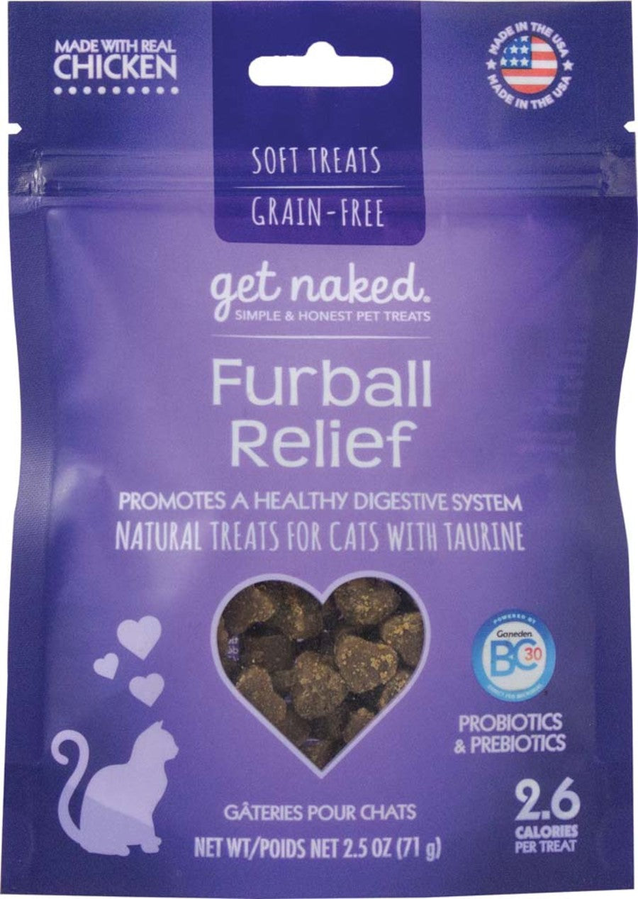 Get Naked® Digestive Health soft treats for cats is formulated with natural dietary fibers and vegetable oils, and fortified with probiotics to nurtures a healthy digestive system. *Recommended replacement product for Get Naked Furball Relief. Free of grain, wheat, corn and soy – these soft treats contain omega fatty acids to support skin health, taurine to support vision and heart health, as well as other benefits. Made with real chicken, your cat will enjoy the delicious flavor while gaining the functional benefits of Get Naked® Digestive Health.