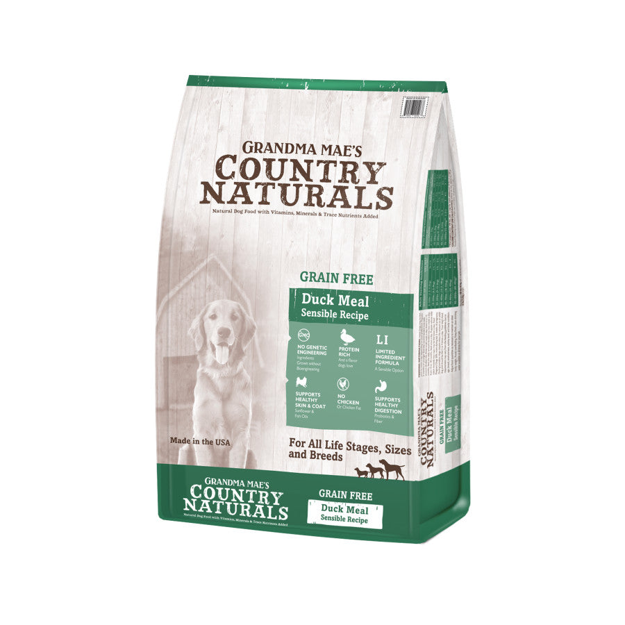Grandma Mae's Country Naturals Grain Free Duck Sensible Recipe is a non-GMO, single-protein formula with healthy, protein rich Duck Meal as the first ingredient. For all life stages, sizes and breeds.