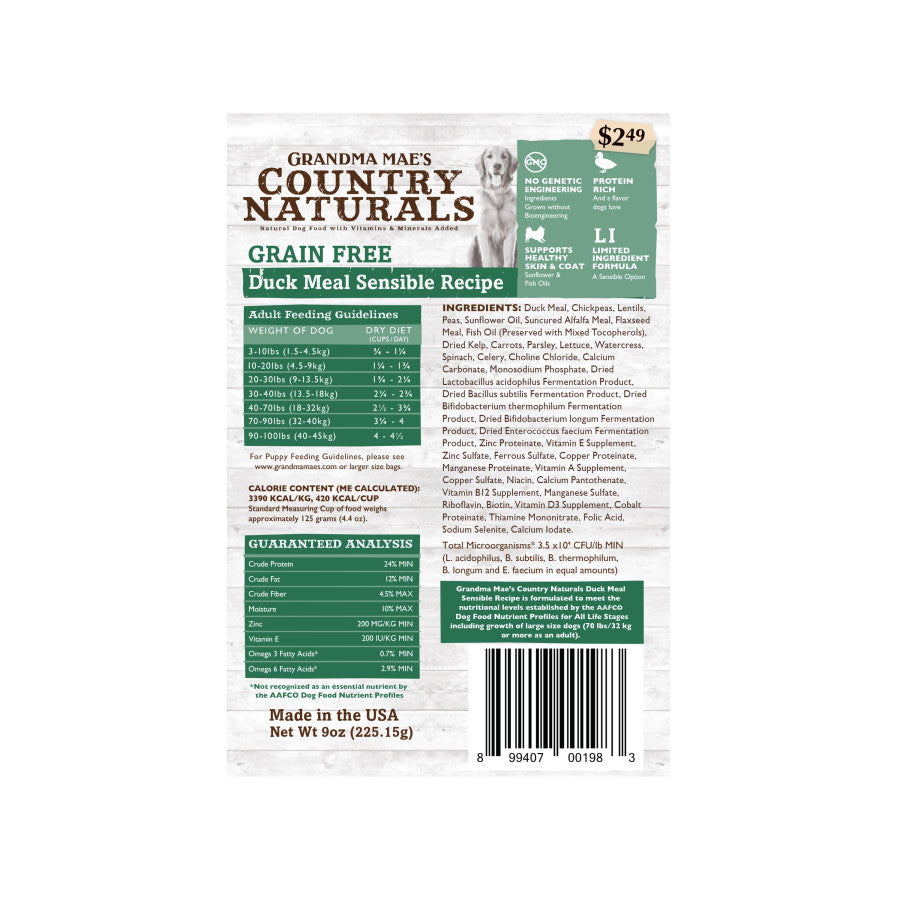 Grandma Mae's Country Naturals Grain Free Duck Sensible Recipe is a non-GMO, single-protein formula with healthy, protein rich Duck Meal as the first ingredient. For all life stages, sizes and breeds.