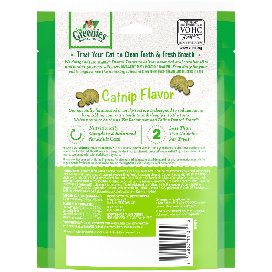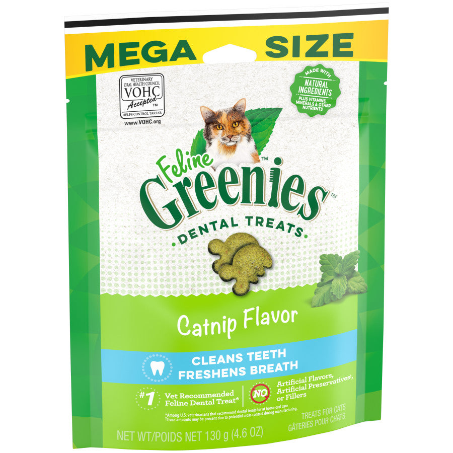 - This convenient pouch contains 4.6 oz. of FELINE GREENIES Crunchy Dental Treats in Catnip Flavor