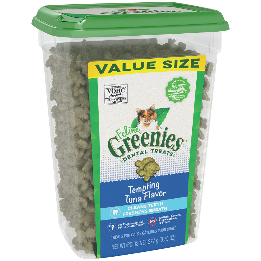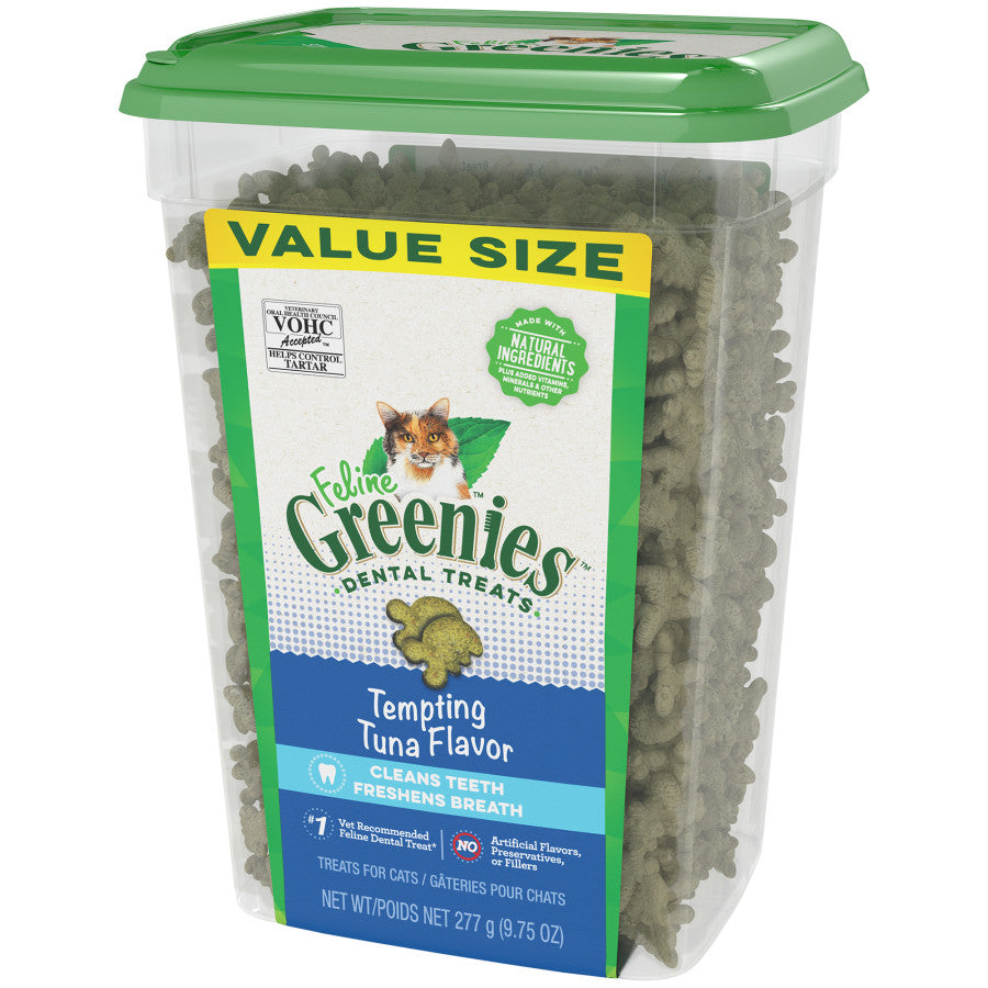 - This bulk tub contains 9.75 oz. of FELINE GREENIES Crunchy Dental Treats in Tempting Tuna Flavor
