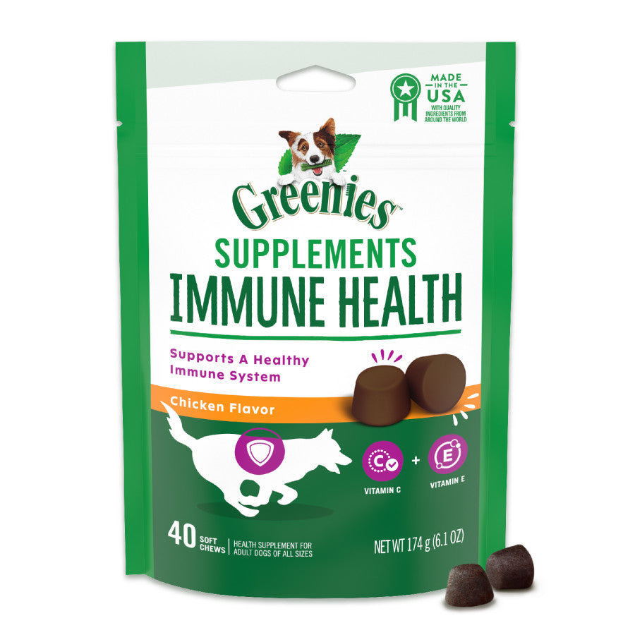 GREENIES, the vet recommended treat brand you trust is making it easy to care for your dog’s health needs. Supplement your dog’s immune health with GREENIES Immune Health Supplements, formulated by a team of Ph.D. Animal Nutritionists, to support a healthy immune system. Made for adult dogs of all sizes, GREENIES Immune Health Supplements contain a powerful blend of antioxidants, Vitamin C and Vitamin E, in an irresistible soft chew made with real chicken that helps support your dog’s natural defenses. Additionally, GREENIES Immune Health soft chews are made in the USA with quality ingredients from around the world with no artificial flavors or preservatives†, and are made without fillers. Simply give once a day to help keep your dog at their best so you can enjoy happy days together.