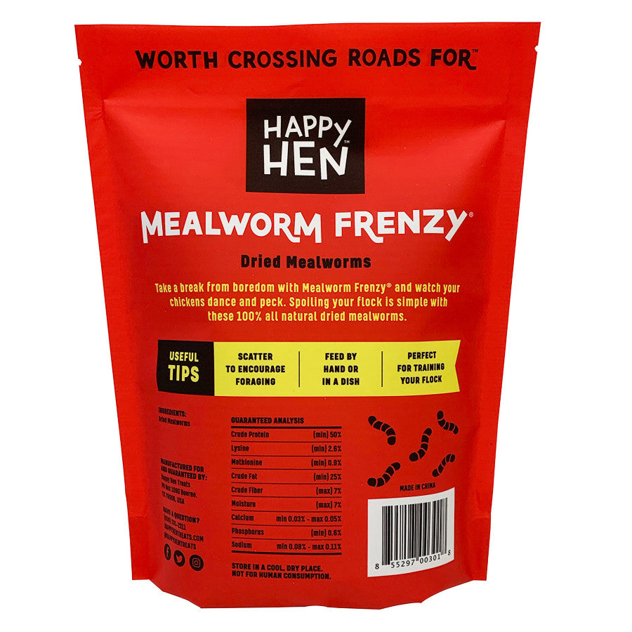 Happy Hen 100% natural whole-dried mealworms with 51% protein value. Perfect for training or taming chickens. Also great for Sugar Gliders, Hedgehogs and Wild Birds. 3.5oz re-sealable zip-lock pouch.