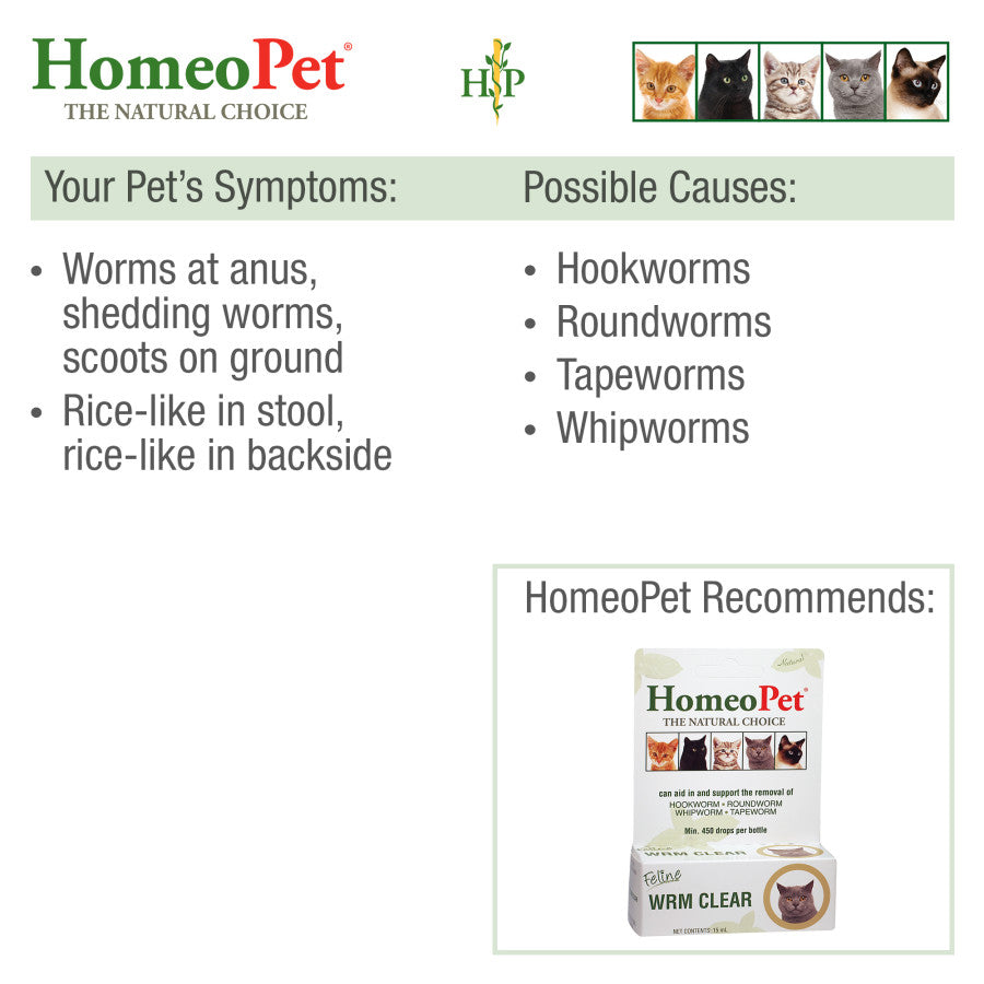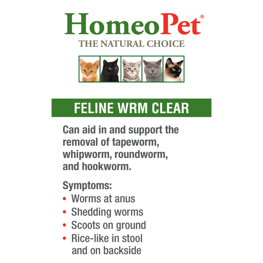 Can aid in and support the removal of tapeworm, whipworm, roundworm, and hookworm in cats. WRM Clear does not kill the worms but can help the animal’s own immune system remove them from the body. May also aid in recovery from worm effects and detoxify from effects of conventional products. 100% natural, no chemicals added, no food withdrawal