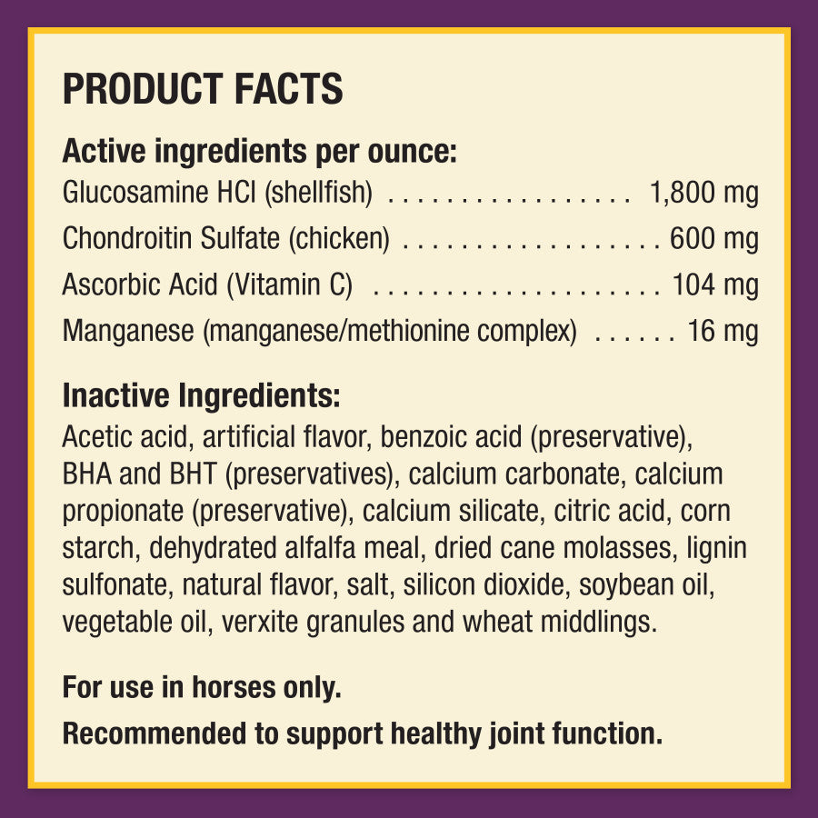 Horse Health Joint Combo Classic contains glucosamine HCl and Chondroitin sulfate, along with the cofactors manganese and ascorbic acid, in a palatable, cinnamon apple-flavored pellet. Glucosamine and Chondroitin are found naturally in the bodies of animals and are necessary for normal joint function. Glucosamine is a natural precursor of glycosaminoglycans (GAGs) and hyaluronic acid. Chondroitin is the primary GAG found in cartilage. Manganese is an important cofactor for the formation of GAGs, and ascorbic acid is required for collagen formation. Together, they act synergistically to support healthy joint function.