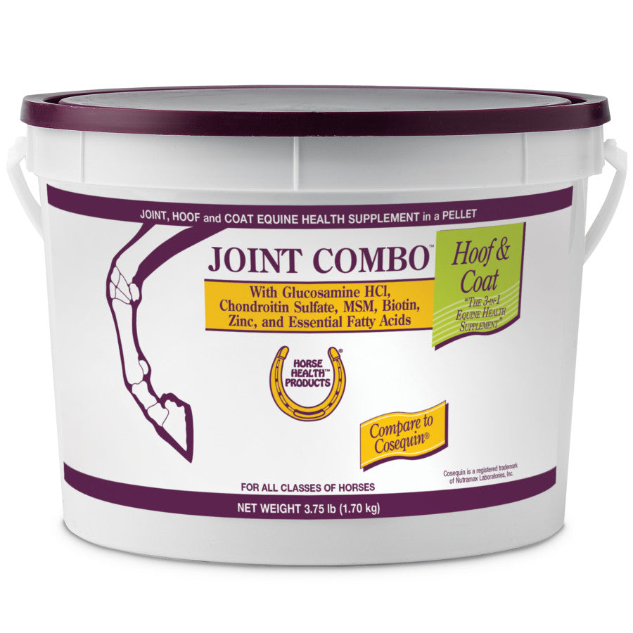 Good nutrition is essential for the overall health of a horse's joints, hooves, and coat condition. While horses must live with the hooves and joints they're born with; there are certain things horse owners can do to help keep their horse healthy and prolong his life and riding career. Providing a quality horse joint supplement with proven ingredients as part of a balanced program can help horses stay at their peak. Joint Combo Hoof & Coat combines the three supplements horse owners want most in one bucket to provide complete joint, hoof, and coat care. This convenient 3-in-1 supplement combines glucosamine, chondroitin sulfate, vitamin C, manganese, and MSM to support normal joint function, healthy cartilage, and collagen synthesis. Provides excellent hoof conditioning with 16 mg of biotin per 2 oz, plus methionine, lysine, and zinc to support strong hooves and healthy hoof growth. It contains essential fatty acids (omega 3 & omega 6) to help maintain healthy skin and a lustrous coat. Palatable apple-cinnamon pellets mix quickly with your horse's regular grain ration.