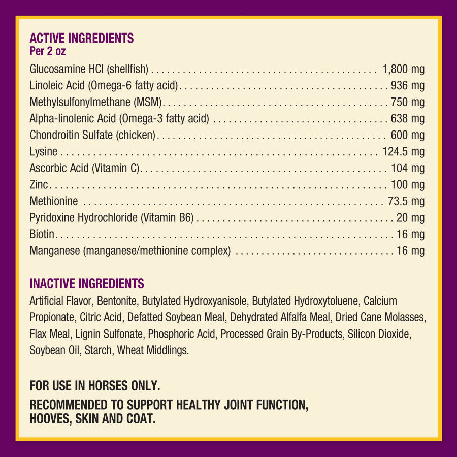 - Proven ingredients: combines glucosamine, chondroitin sulfate, vitamin c, manganese and msm for joints; biotin, methionine, lysine, and zinc for hooves; omega 3 & 6 fatty acids for skin & coat.
