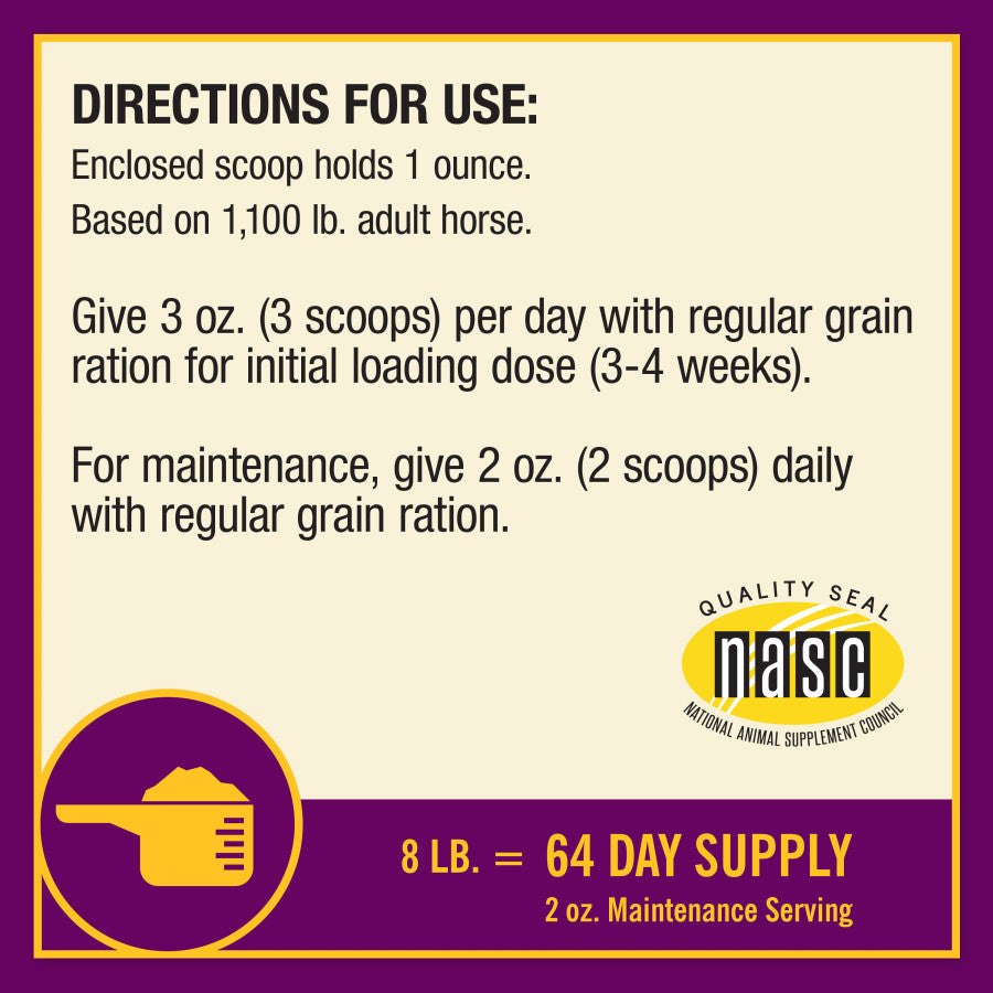 - Use Instructions: Enclosed scoop holds 1 oz.Based on 1,100 lb. adult horse.Give 3 oz. (3 scoops) per day with regular grain ration for initial loading dose (3-4 weeks).For maintenance, give 2 oz. (2 scoops) daily with regular grain ration.