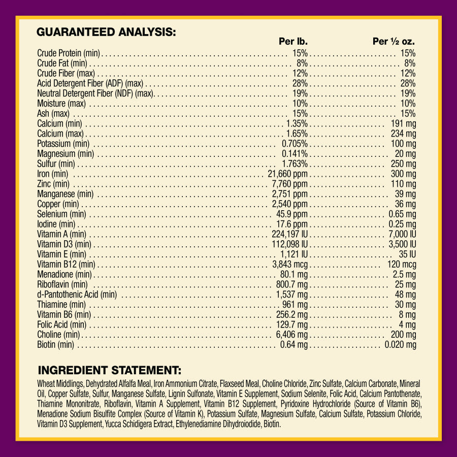 Vitamins and minerals make up a small part of the horse’s diet but are essential to providing a balanced nutritional foundation for overall health. Although most of a horse's dietary needs can be met by feeding a good quality forage, there are a number of situations in which a horse can benefit from a vitamin/mineral supplement such as young, growing horses, broodmares, debilitated horses, senior horses, and performance horses. Red blood cells deliver oxygen to cells and remove carbon dioxide. This oxygen supply is critical for the performance horse during aerobic exercise and recovery. Red Cell Vitamin-Iron-Mineral Supplement provides important vitamins and minerals that may be lacking in the diet. Contains 300 mg. of iron per ounce to help maintain normal blood cell health, energy, and performance demands. Plus B-complex vitamins support metabolism and a healthy immune system. Palatable, yucca-flavored pellets are easy to feed, provide less waste, less mess, and won't freeze in cold temperatures. Ideal for horses of all ages, disciplines, and workloads. Make sure your horse is getting the nutrition he needs to look, feel and perform his best.