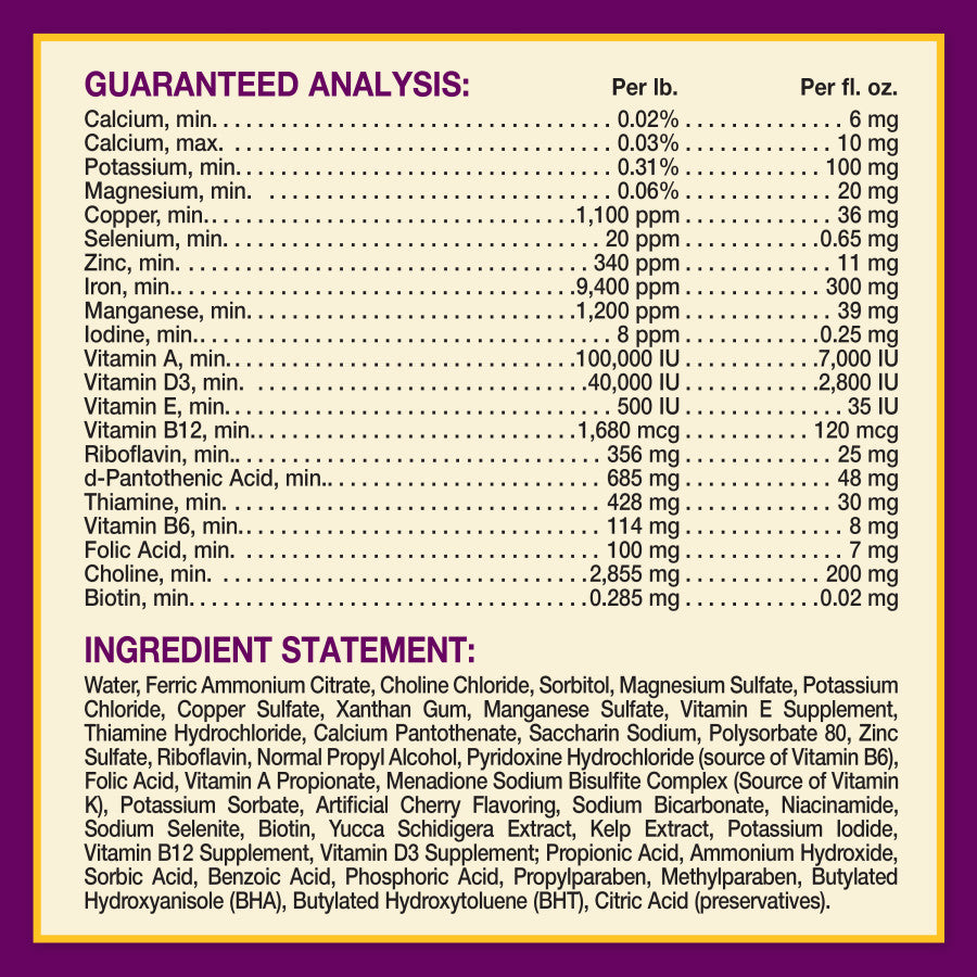 - Ingredients: Water; Ferric Sulfate; Ammonium Hydroxide; Citric Acid; Choline Chloride; Zinc Sulfate; Sorbitol; Magnesium Sulfate; Potassium Chloride; Vitamin E supplement; Vitamin A Acetate; D-activated Animal Sterol irradiated (source of Vitamin D-3); Copper Sulfate; Xanthan Gum; Manganese Sulfate; Thiamine Hydrochloride; Calcium Pantothenate; Saccharin Sodium; Riboflavin; Pyridoxine Hydrochloride; Folic Acid; Cobalt Sulfate; Menadione Sodium Bisulfite complex; Sodium Benzoate (a preservative); Niacinamide; Sodium Bicarbonate; Biotin; Sodium Selenite; Kelp Extract; Yucca Schidigera Extract; Ethylenediamine Dihydriodide; Vitamin B-12 Supplement; Artificial Cherry Flavoring; FD&C Red #40 and Potassium Sorbate (a preservative)
